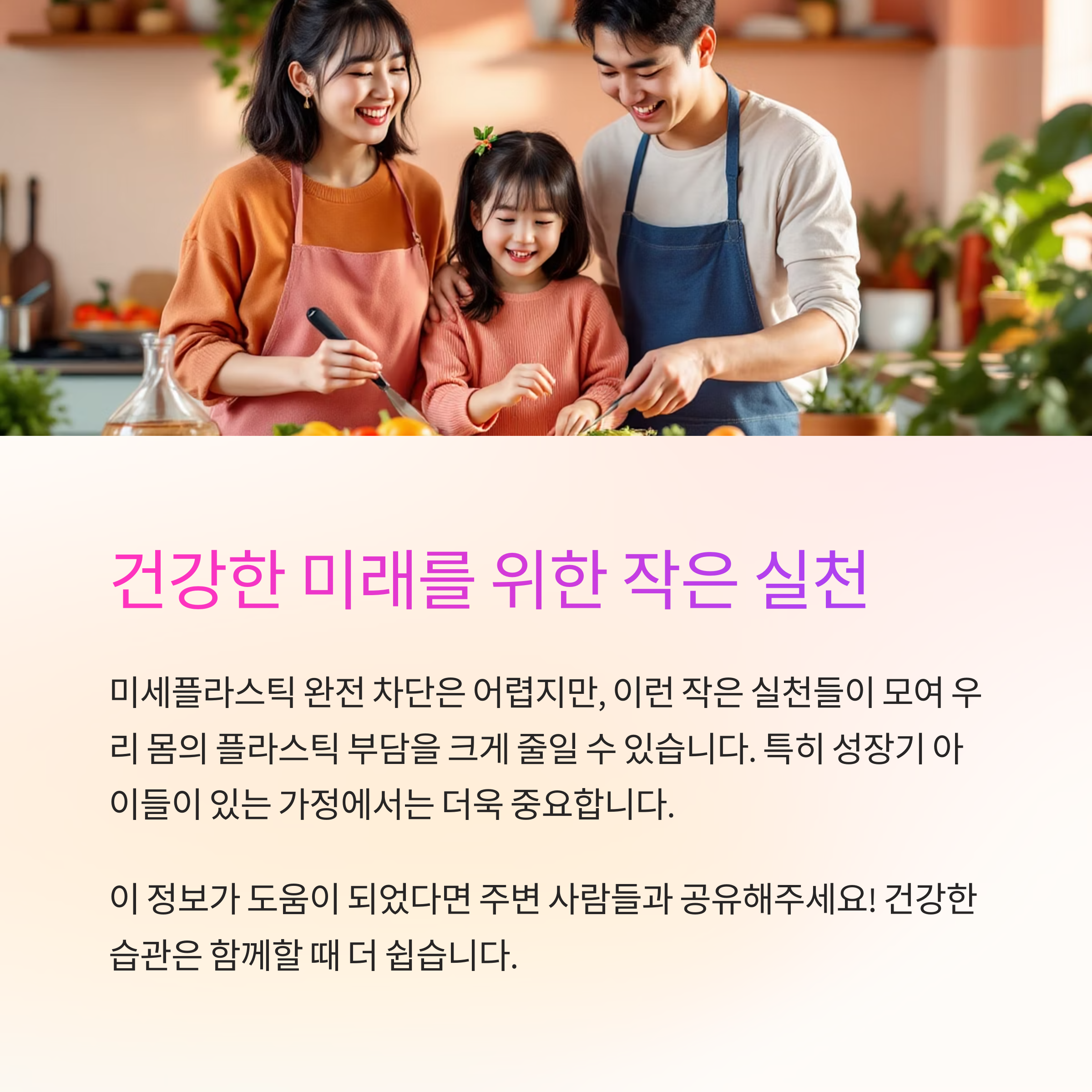 특히 성장기 아이들이 있는 가정에서는 더욱 신경 써야 할 부분입니다. 건강한 식습관과 생활습관으로 미세플라스틱 걱정 없는 일상을 만들어가시길 바랍니다.