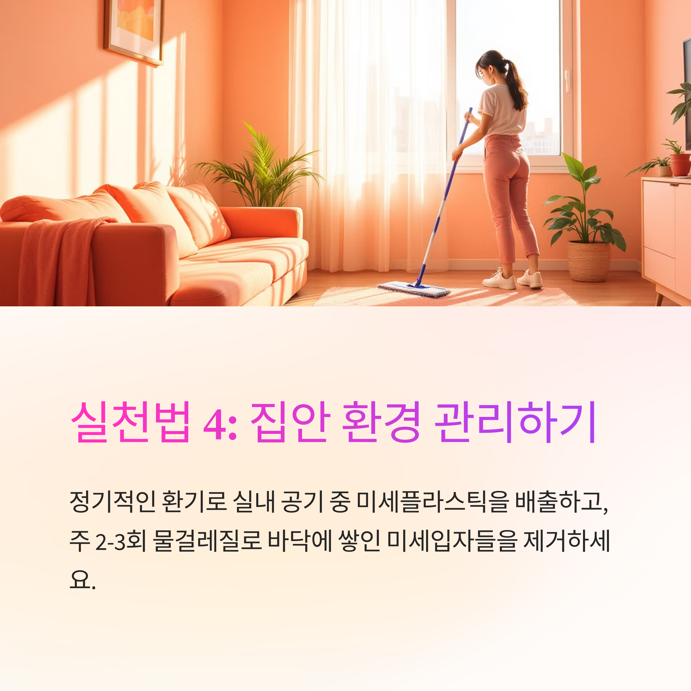 정기적인 환기로 실내 공기 중 미세플라스틱을 배출하고, 청소할 때는 물걸레질을 자주 하여 바닥에 쌓인 미세입자들을 제거하세요.