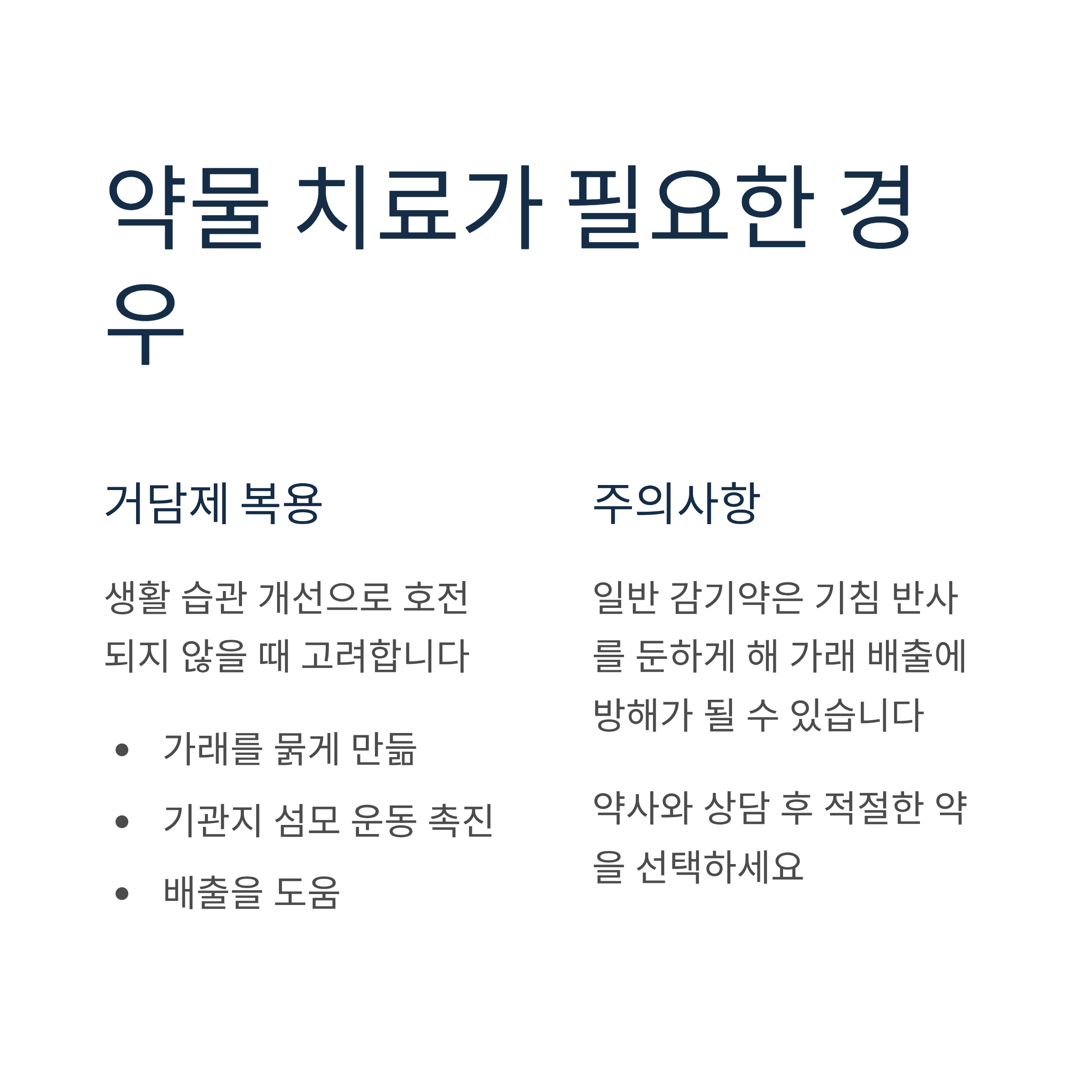 생활 습관 개선으로 호전되지 않는다면 거담제 복용을 고려할 수 있습니다. 거담제는 가래를 묽게 만들고 기관지 섬모 운동을 촉진해 배출을 돕습니다. 다만 일반 감기약은 기침 반사를 둔하게 해 가래 배출에 방해가 될 수 있으니, 약사와 상담 후 적절한 약을 선택하세요.