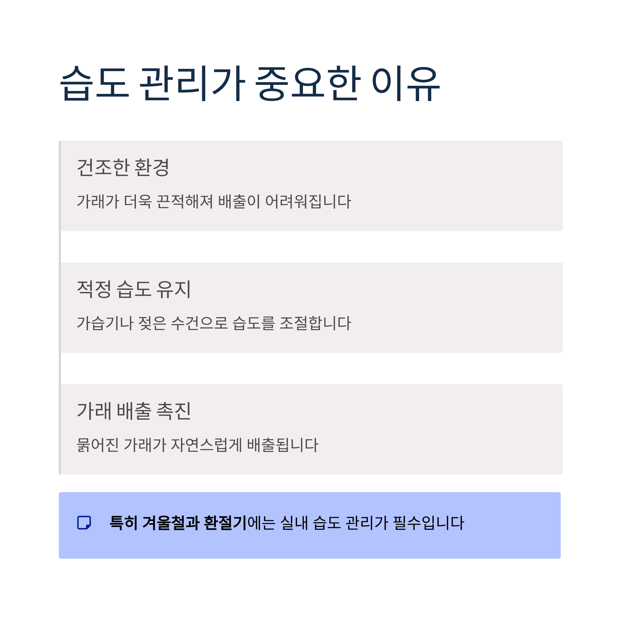 건조한 환경은 가래를 더욱 끈적하게 만듭니다. 가습기를 사용하거나 젖은 수건을 실내에 걸어두어 적정 습도를 유지하면 가래가 묽어져 배출이 쉬워집니다. 특히 겨울철과 환절기에는 실내 습도 관리가 필수입니다.