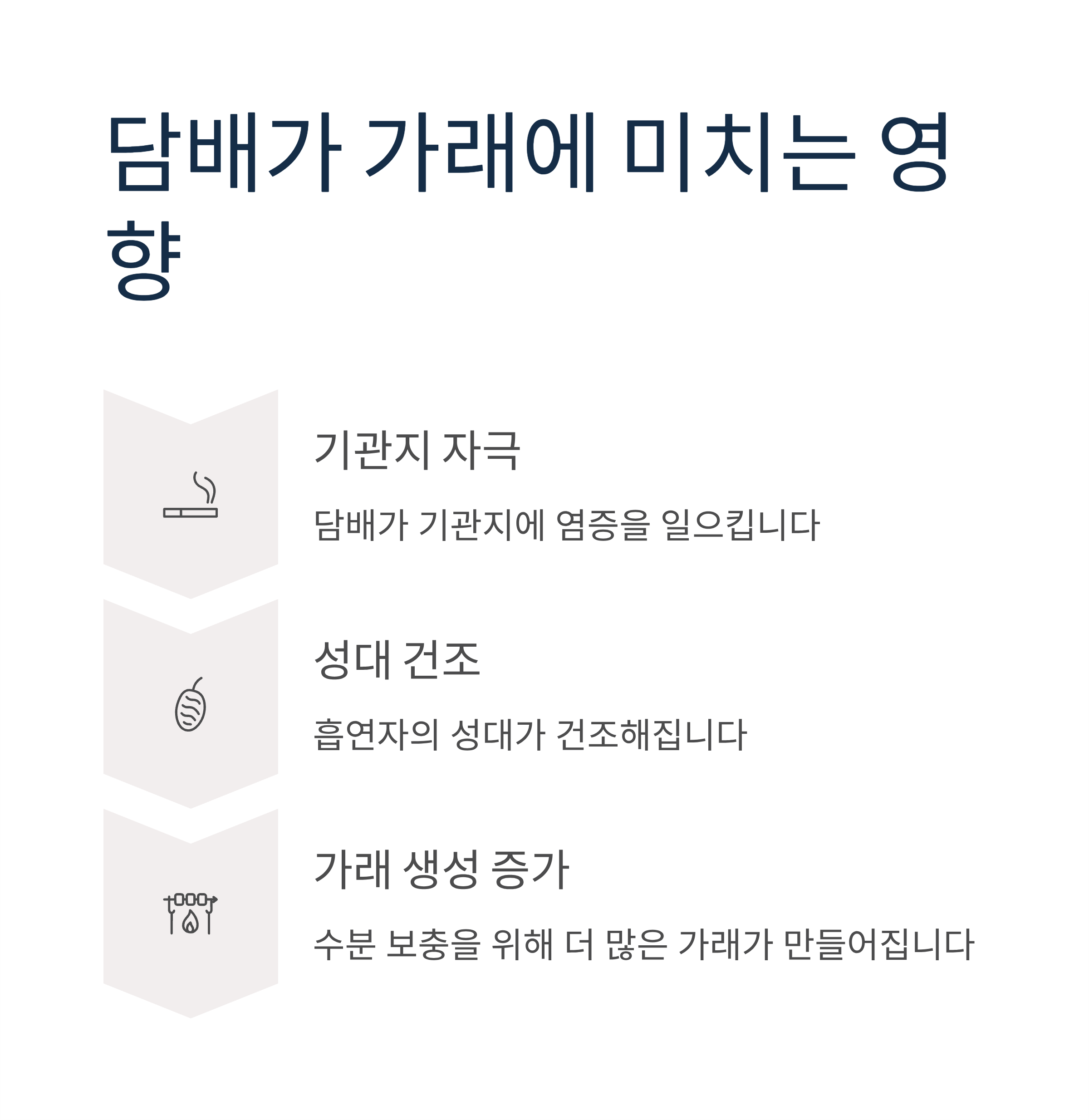 담배는 기관지를 자극해 염증을 일으키고 가래 생성을 촉진합니다. 흡연자는 성대가 건조해지면서 우리 몸이 수분을 보충하기 위해 더 많은 가래를 만들어냅니다. 금연은 가래 제거의 필수 조건입니다.