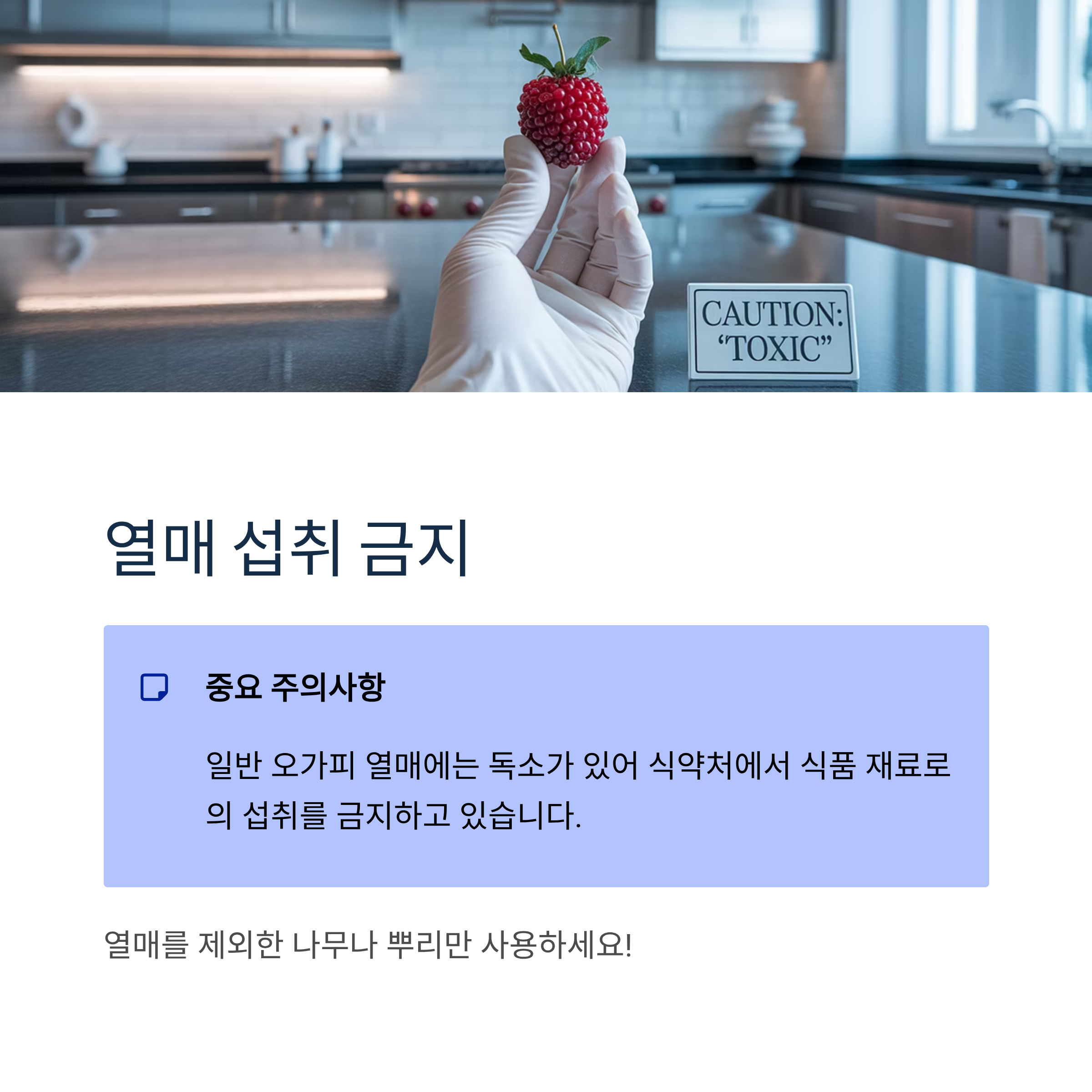 일반 오가피의 경우 열매에 독소가 있어 식약처에서는 식품 재료로의 섭취를 금하고 있습니다. 그렇기 때문에 열매를 제외한 나무나 뿌리를 사용하는 것이 좋으며, 되도록 가시오가피를 섭취하는 것이 좋습니다.