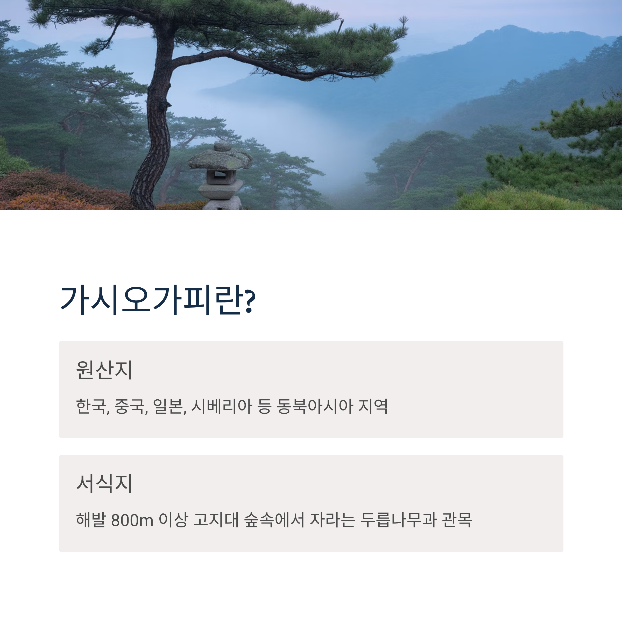 가시오가피는 두릅나무과에 속하는 관목으로, 원산지는 우리나라, 중국, 일본, 시베리아 등 동북아시아 지역입니다. 해발 800m 이상 고지대 숲속에서 자랍니다.