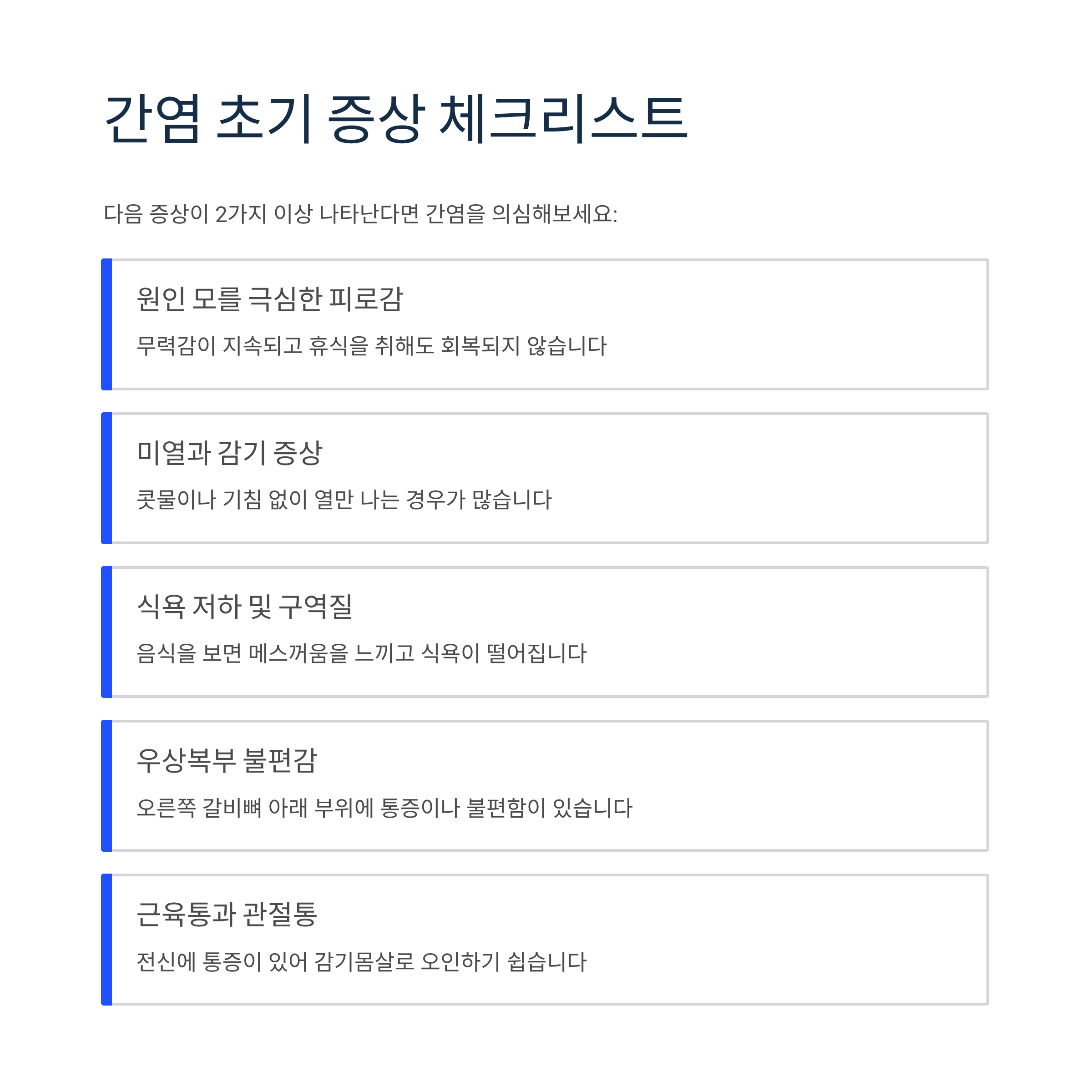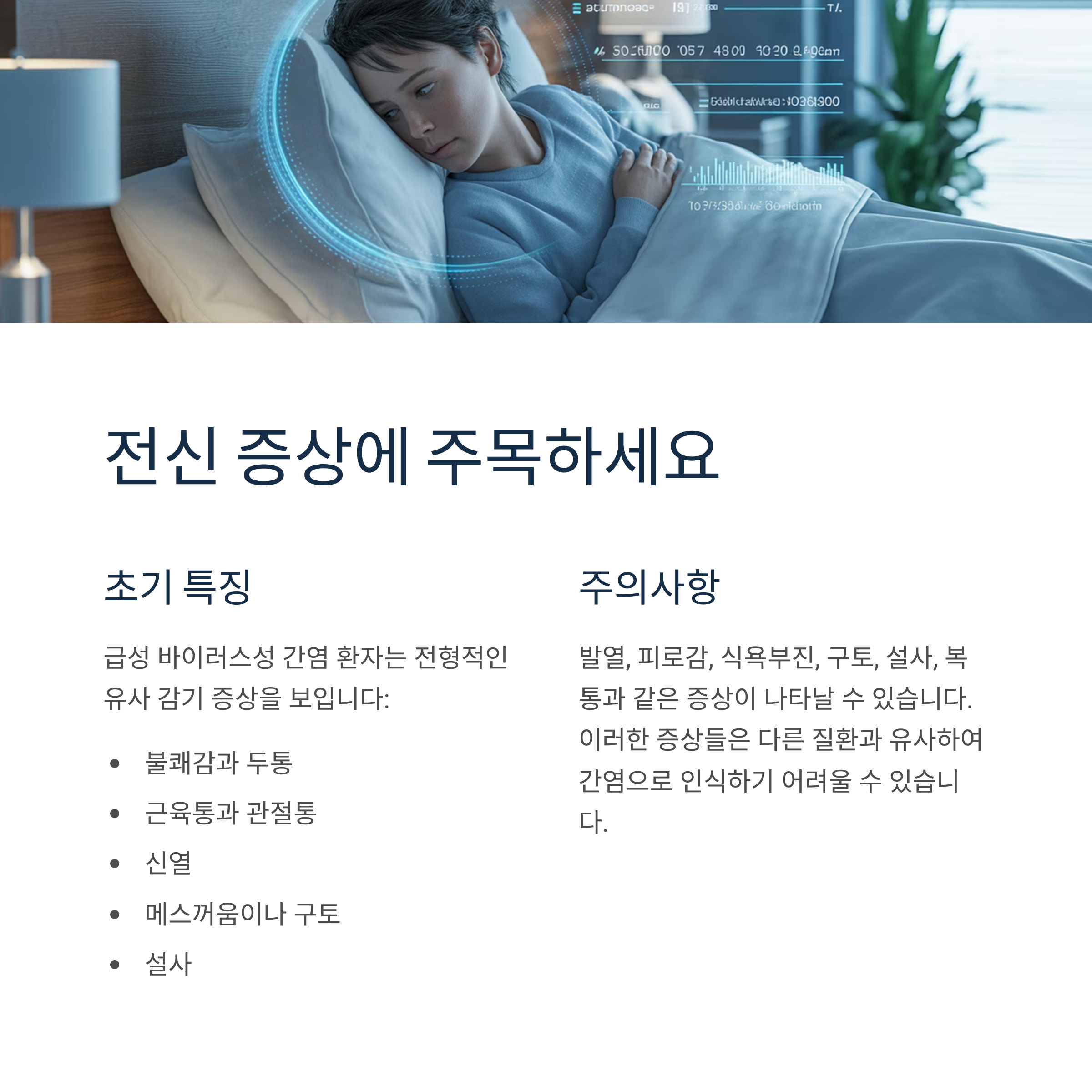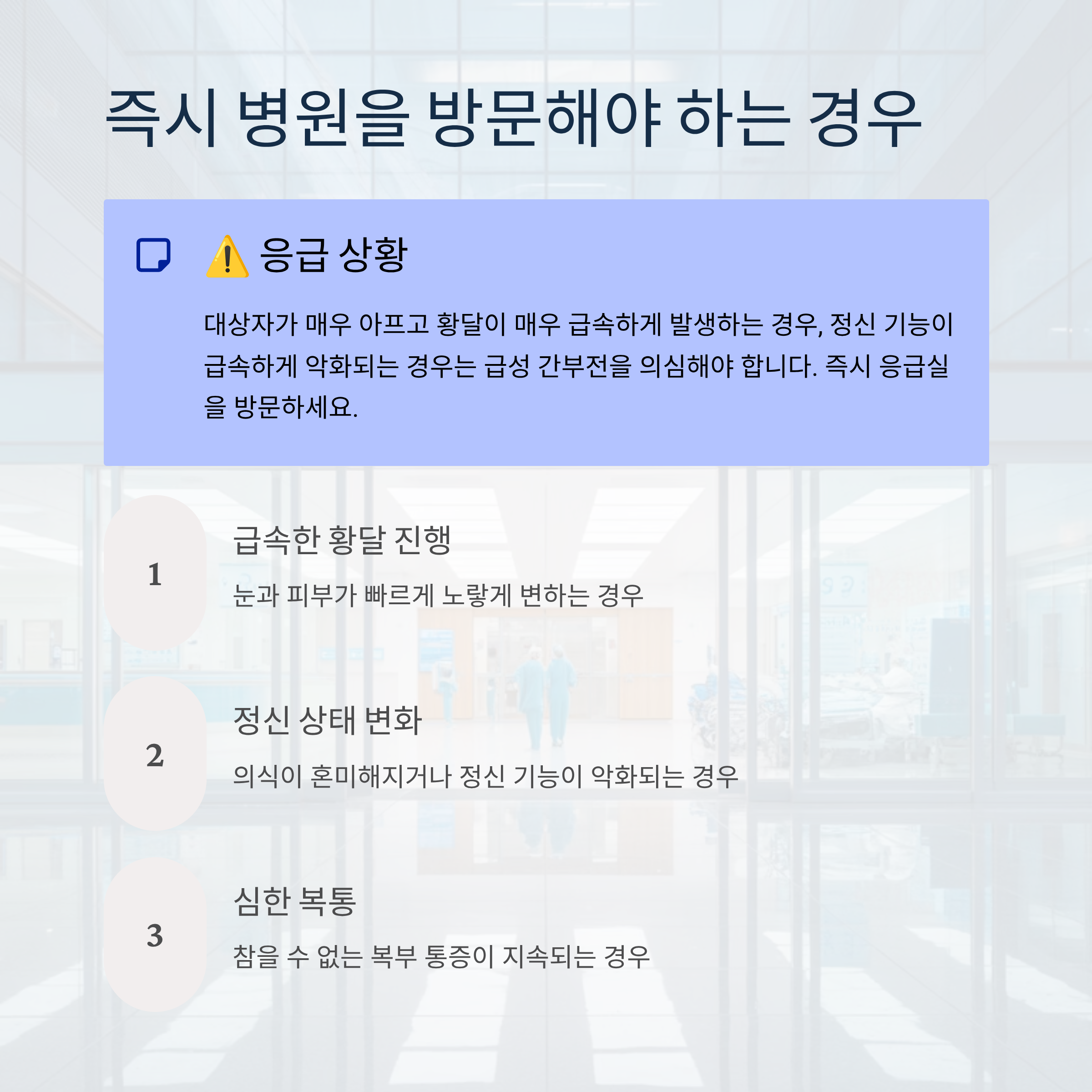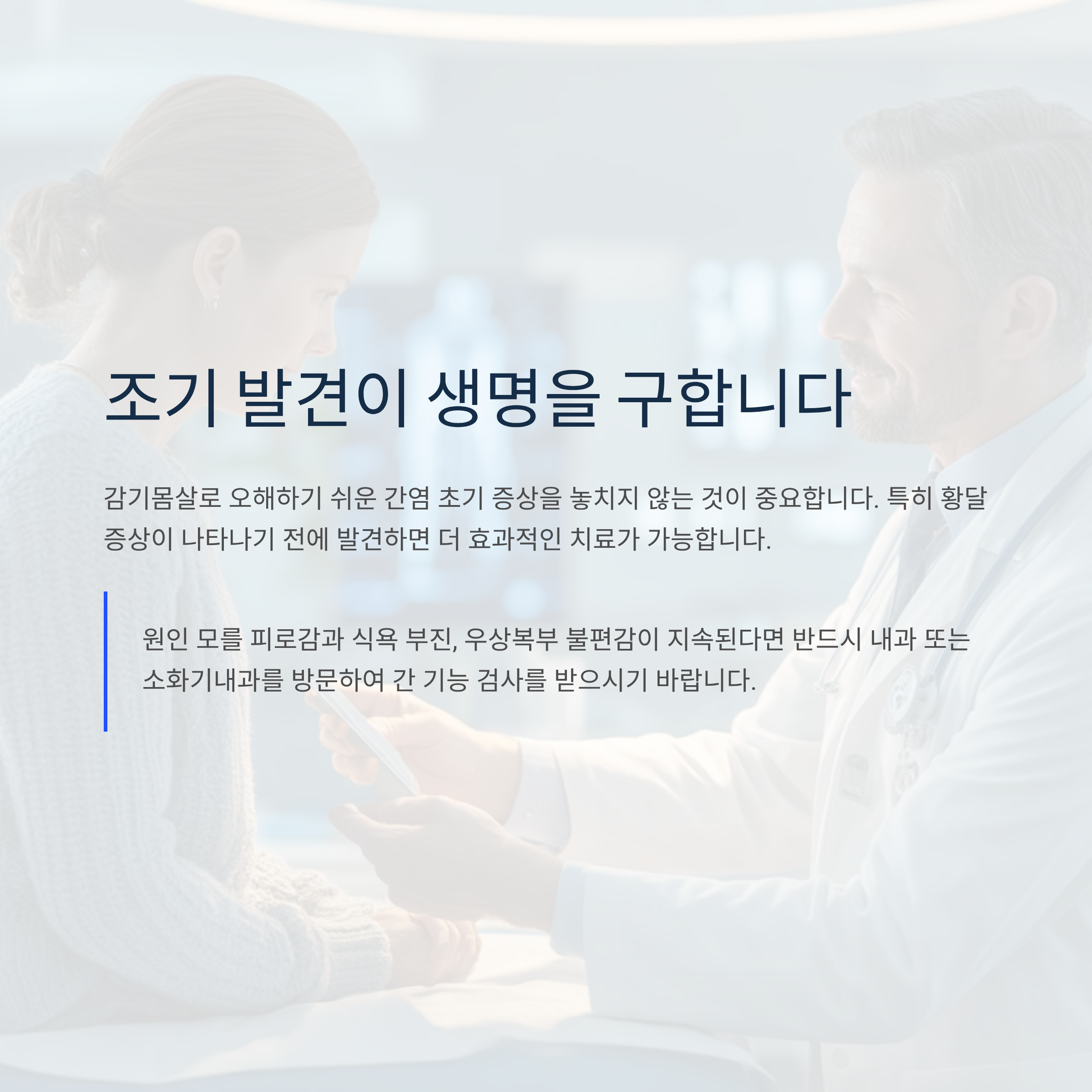 감기몸살로 오해하기 쉬운 간염 초기 증상을 놓치지 않는 것이 중요합니다. 특히 황달 증상이 나타나기 전에 발견하면 더 효과적인 치료가 가능합니다.