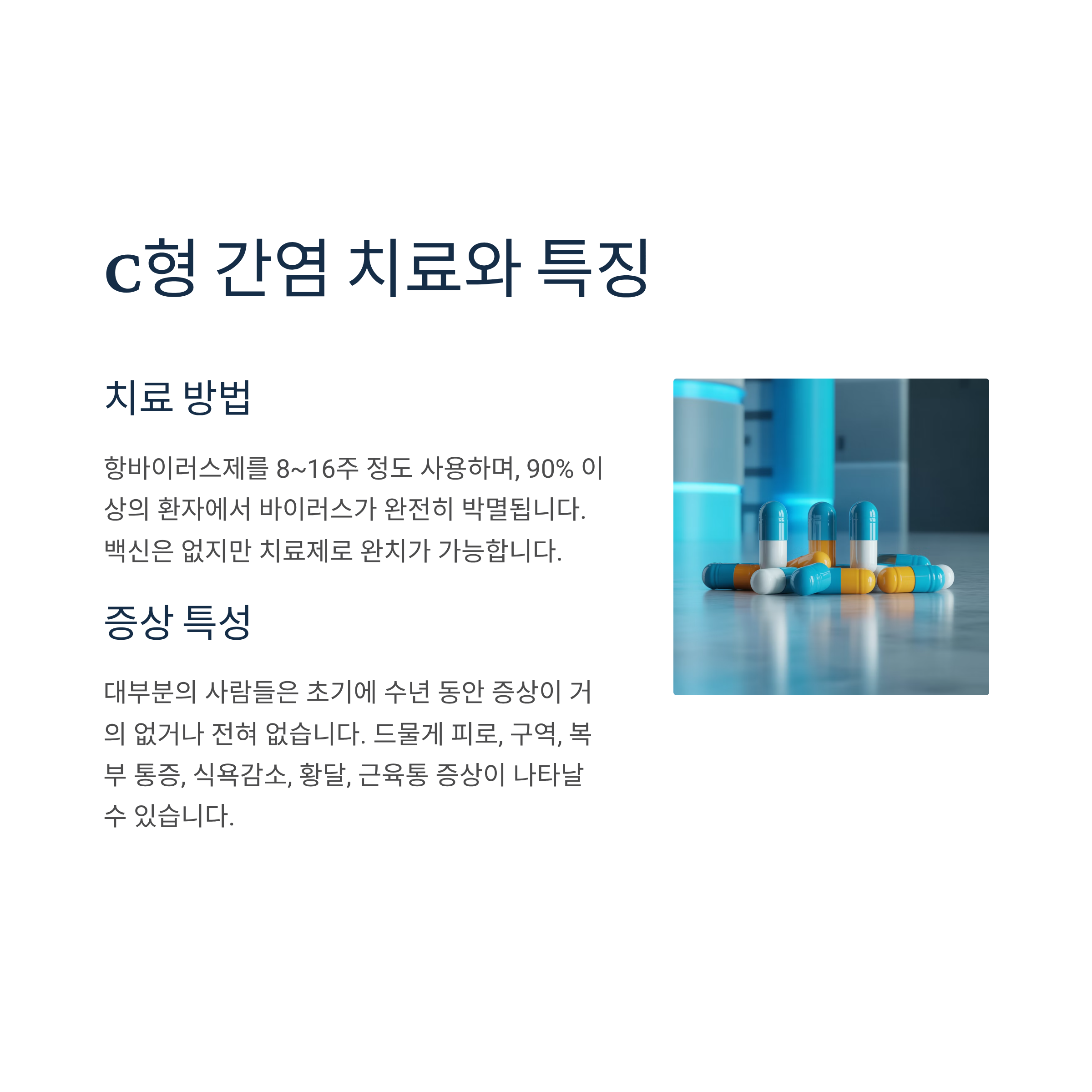 - 치료 시 항바이러스제를 8~16주 정도 사용하며, 90% 이상의 환자에서 바이러스가 완전히 박멸됨