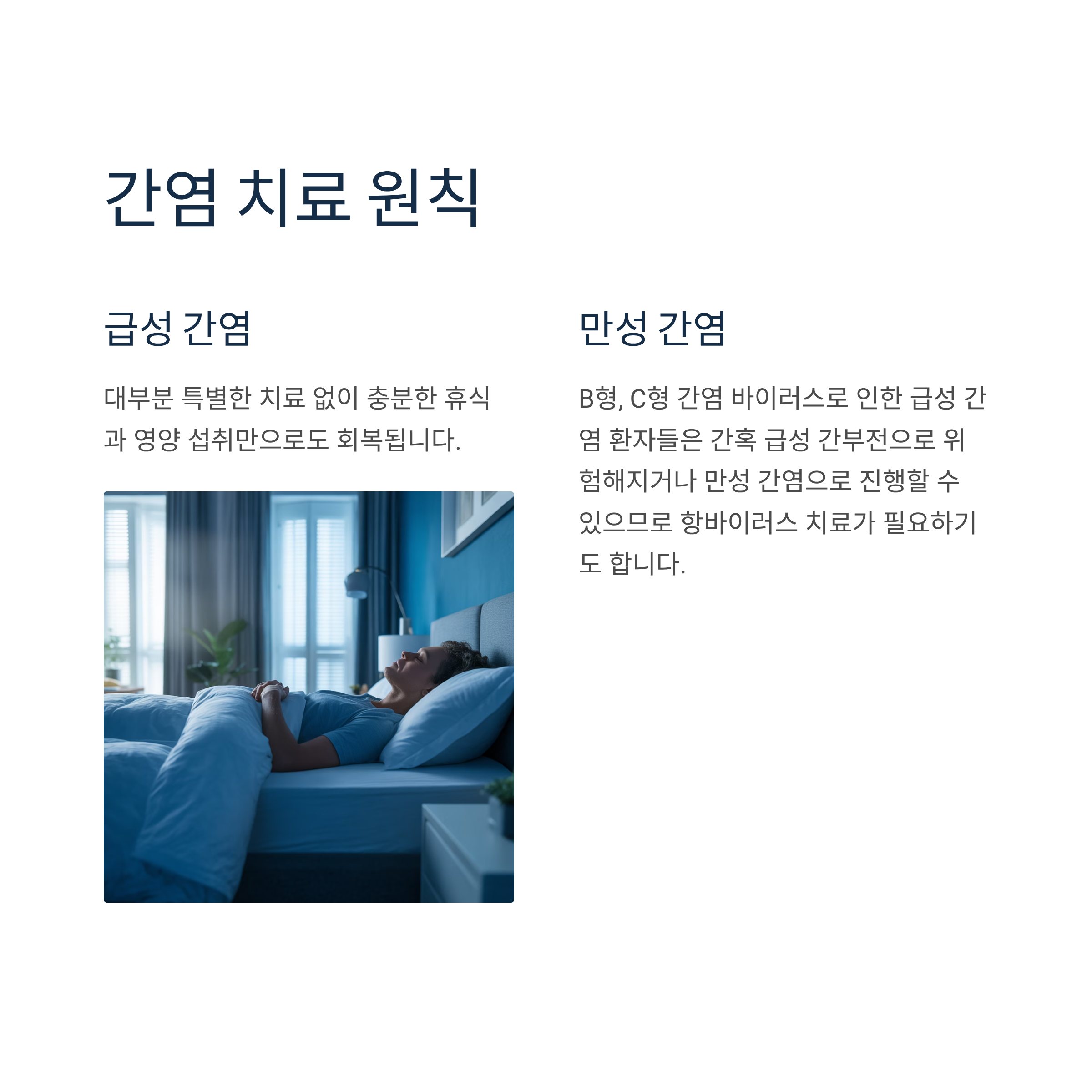 급성 간염 환자들은 대부분 특별한 치료 없이 충분한 휴식과 영양 섭취만으로도 회복됩니다. 하지만 B형, C형 간염 바이러스로 인한 급성 간염 환자들은 간혹 급성 간부전으로 위험해지거나 만성 간염으로 진행할 수 있으므로 항바이러스 치료가 필요하기도 합니다.
