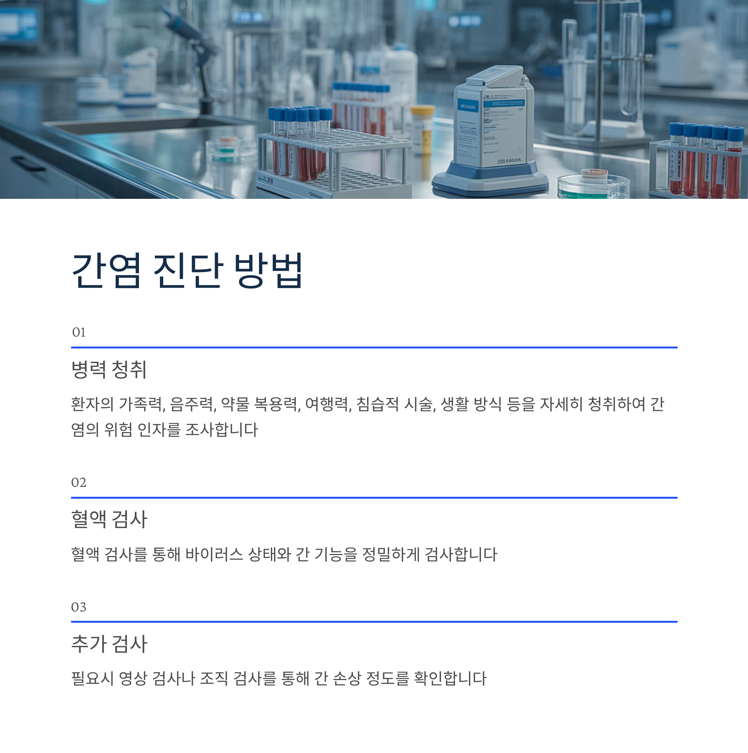 환자의 가족력, 음주력, 약물 복용력, 여행력, 침습적 시술, 생활 방식 등을 자세히 청취하여 간염의 위험 인자를 조사하고, 혈액 검사를 통해 바이러스 상태와 간 기능을 검사합니다.