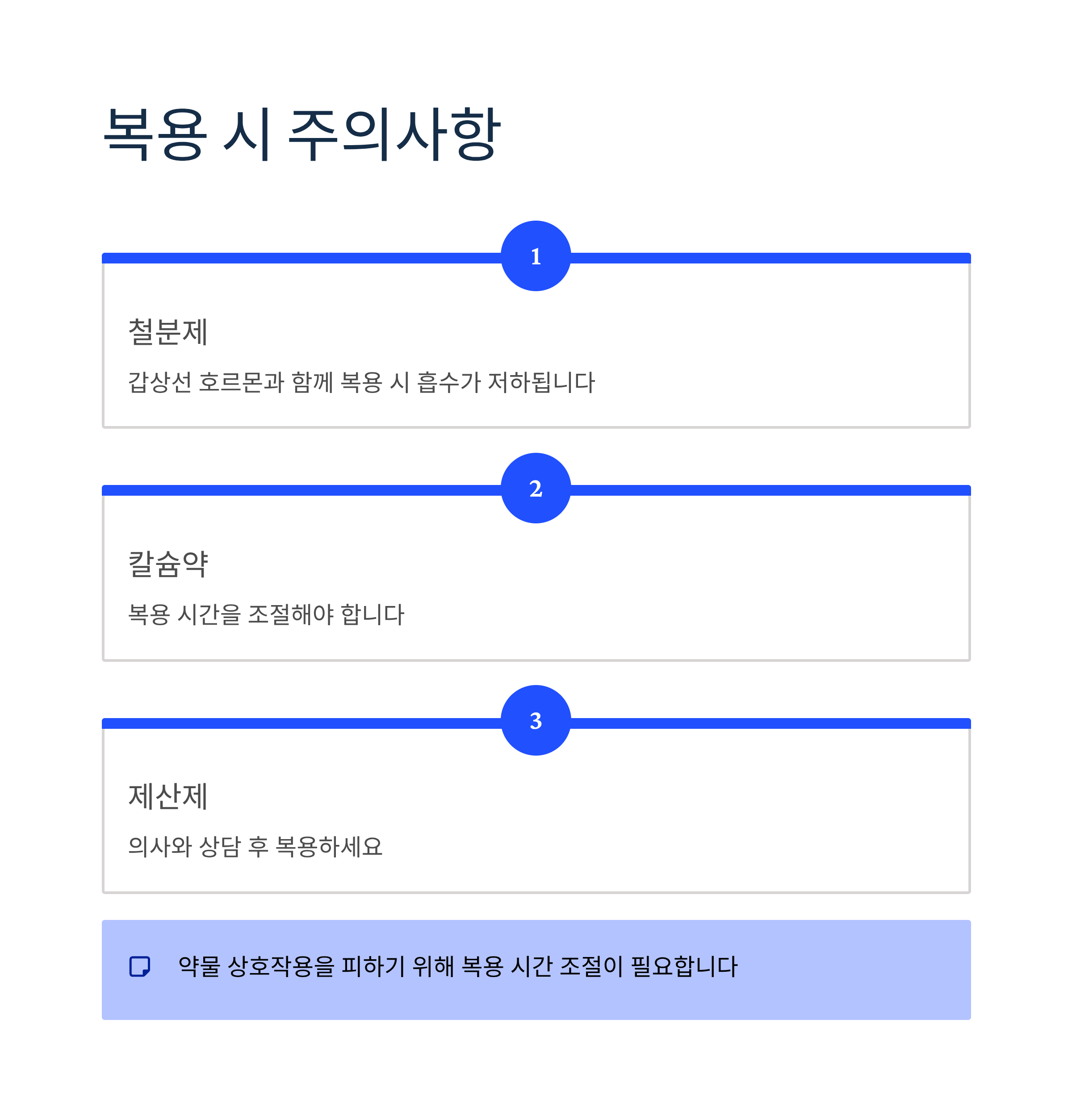 또한 철분제나 칼슘약, 제산제 등과 함께 갑상선 호르몬 제제를 복용할 경우 흡수가 저하될 수 있으므로, 복용 시간을 조절하거나 의사와 상담이 필요합니다.