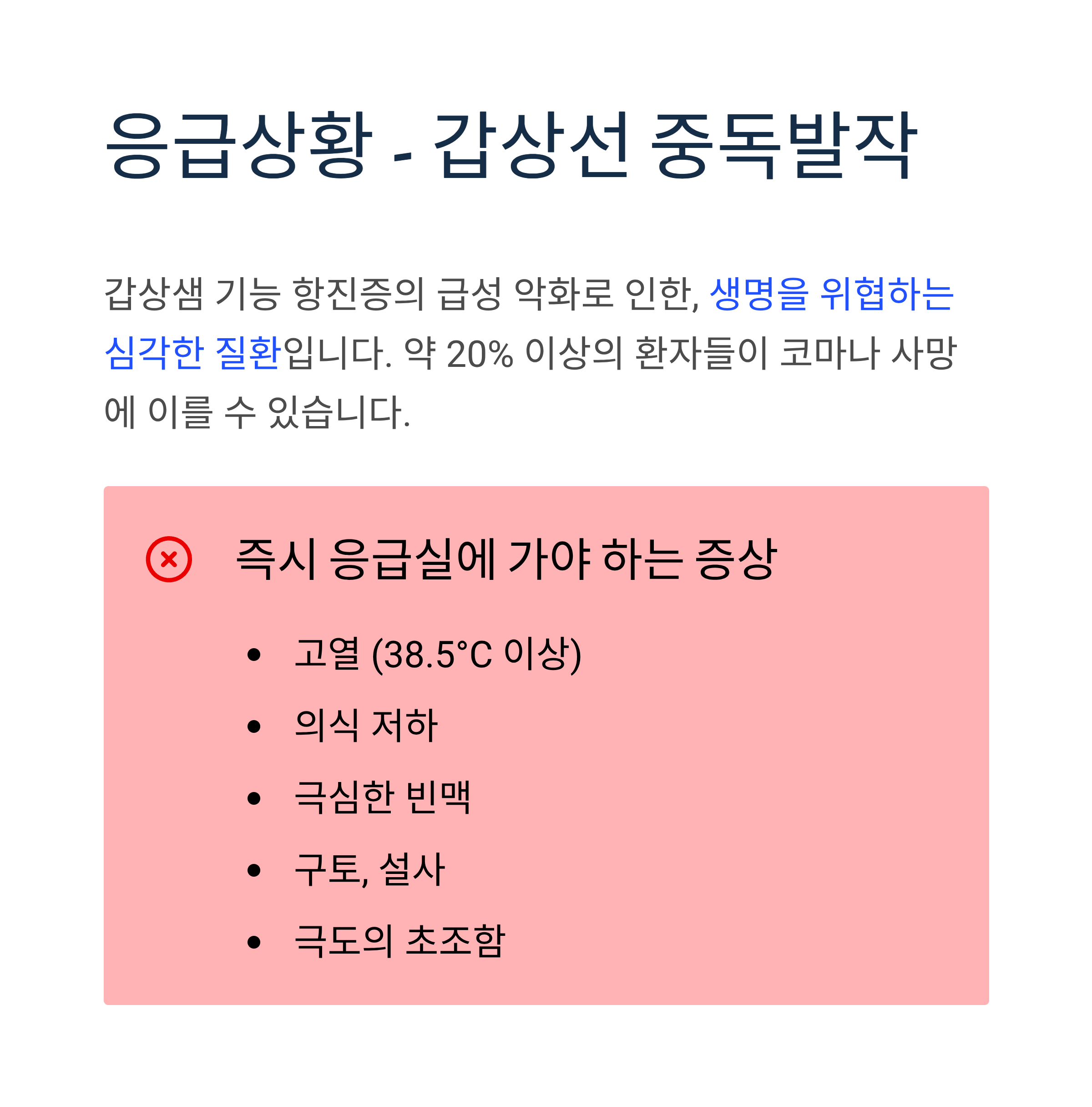 갑상샘 기능 항진증의 급성 악화로 인한 생명을 위협하는 질환입니다. 약 20% 이상의 환자가 코마나 사망에 이를 수 있으므로 다음 증상 시 즉시 응급실로 가야 합니다:
