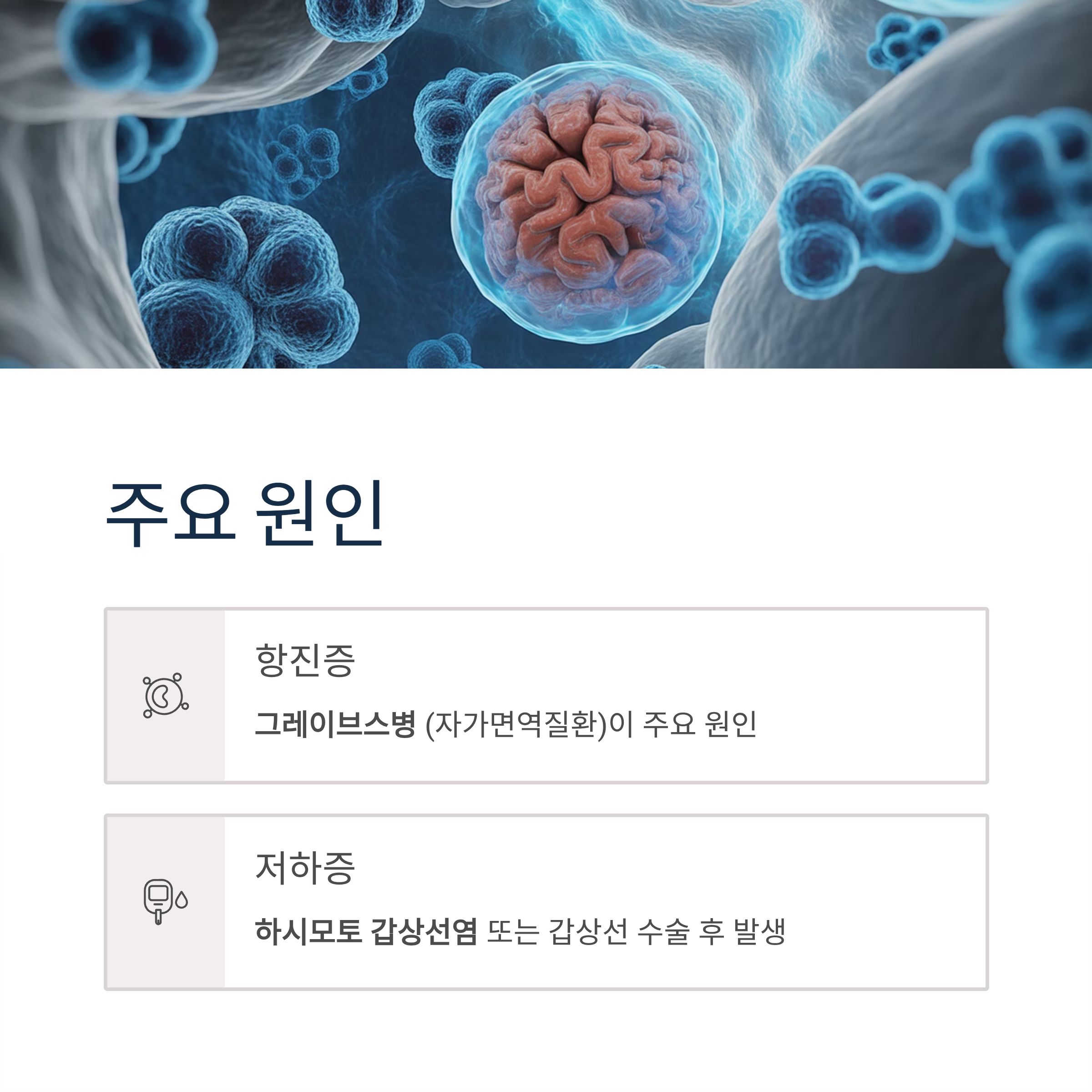 항진증은 그레이브스병(자가면역질환)이 주요 원인이며, 20~40대 여성에게 많이 발생합니다. 저하증은 하시모토 갑상선염이나 갑상선 수술 후 발생하며, 중년 여성의 발병률이 높습니다.