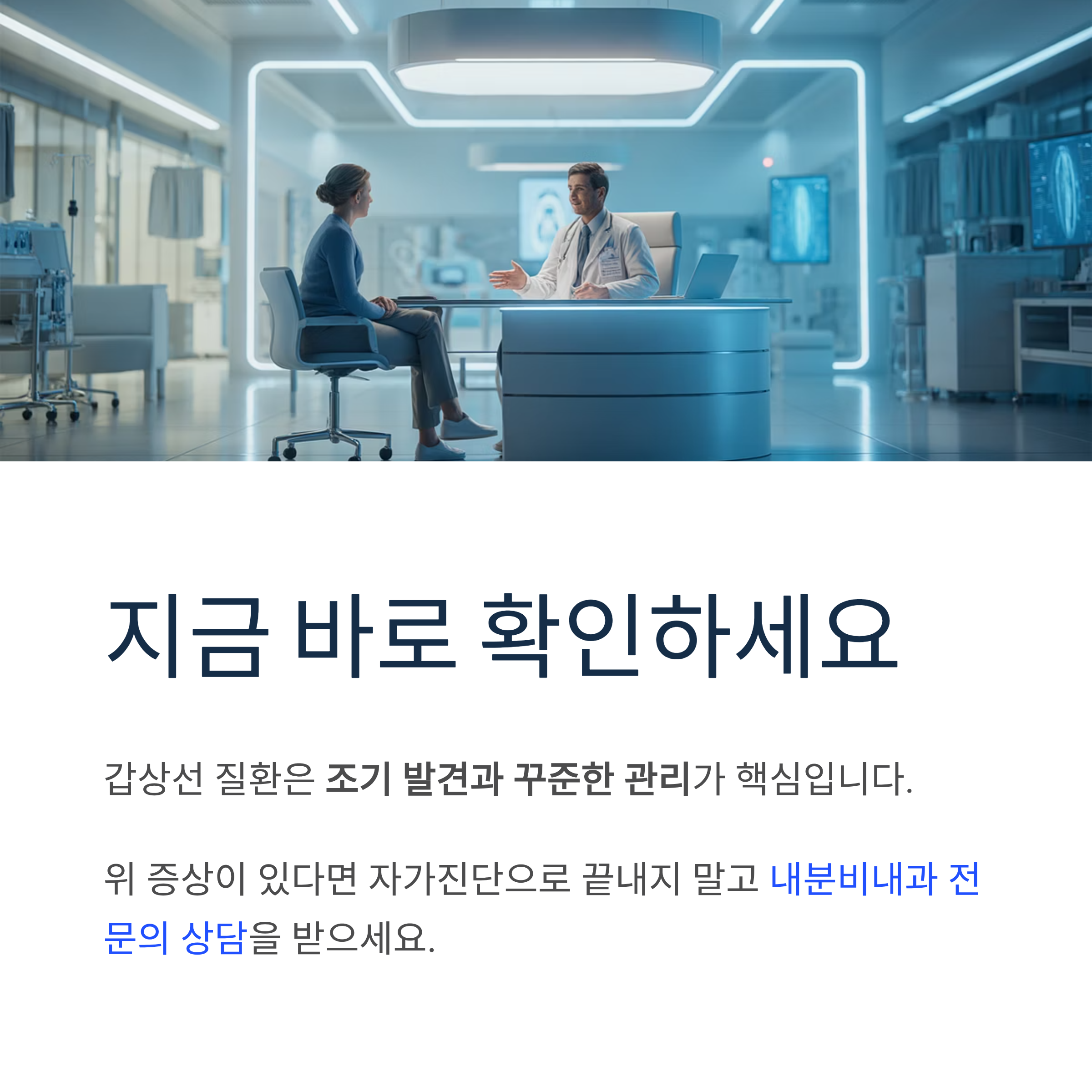 갑상선 질환은 조기 발견과 꾸준한 관리가 핵심입니다. 위 증상이 있다면 자가진단으로 끝내지 말고 전문의 상담을 받아 정확한 치료를 시작하세요.
