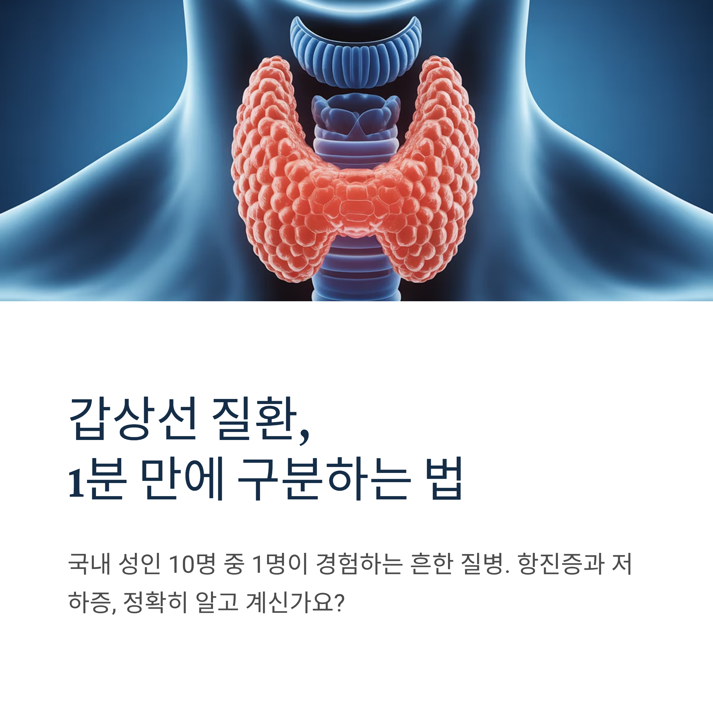 "요즘 피곤한데 갑상선 문제일까요?" 많은 분들이 묻는 질문입니다. 갑상선 질환은 국내 성인 10명 중 1명이 경험하는 흔한 질병이지만, 항진증과 저하증을 정확히 구분하지 못해 치료 시기를 놓치는 경우가 많습니다. 오늘은 두 질환의 핵심 차이점을 명확하게 알려드리겠습니다.