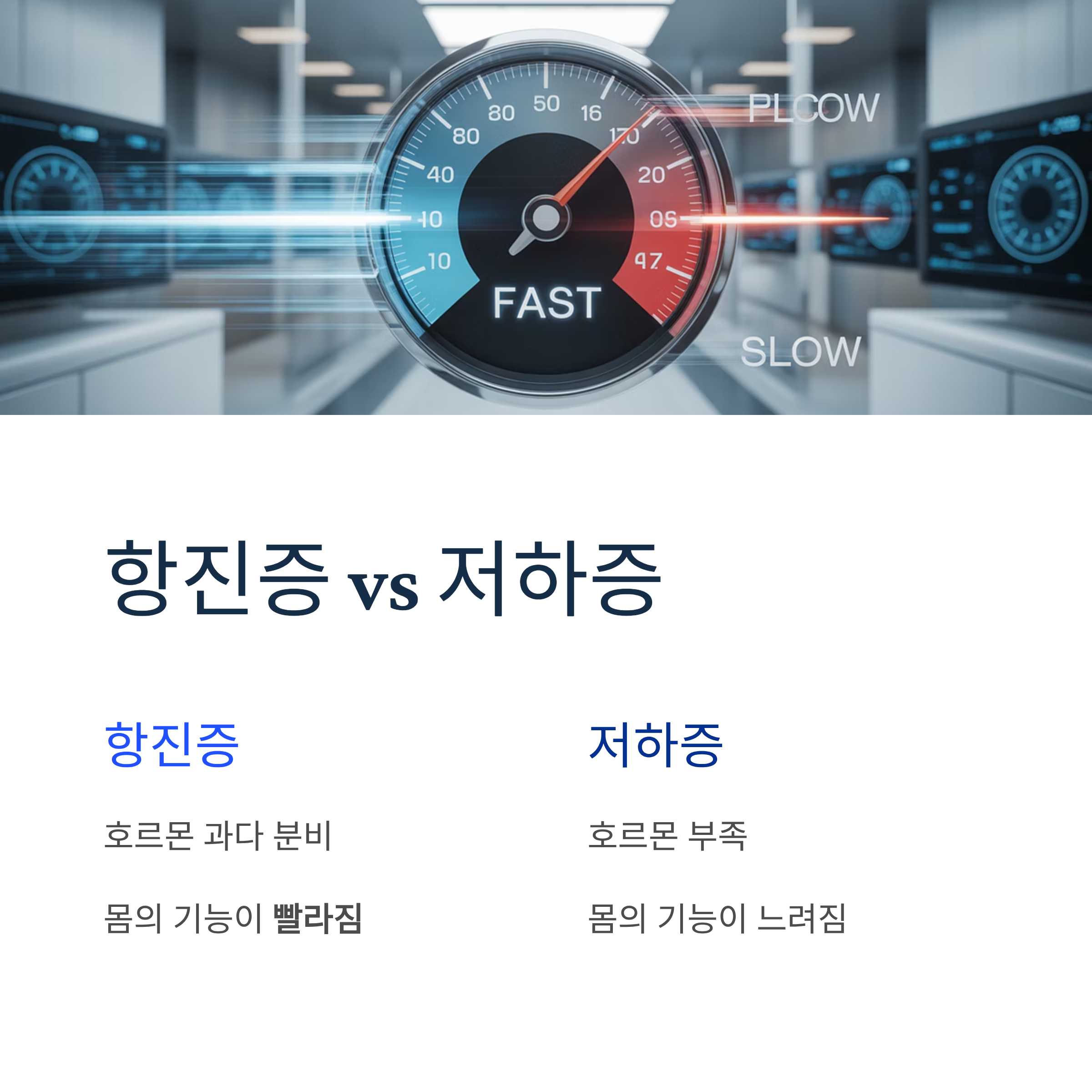 갑상선은 목 앞쪽에 위치한 나비 모양의 내분비 기관으로, 신진대사를 조절하는 호르몬을 분비합니다. 항진증은 호르몬이 과다 분비되어 몸의 기능이 빨라지는 상태이고, 저하증은 호르몬이 부족해 몸의 기능이 느려지는 상태입니다.