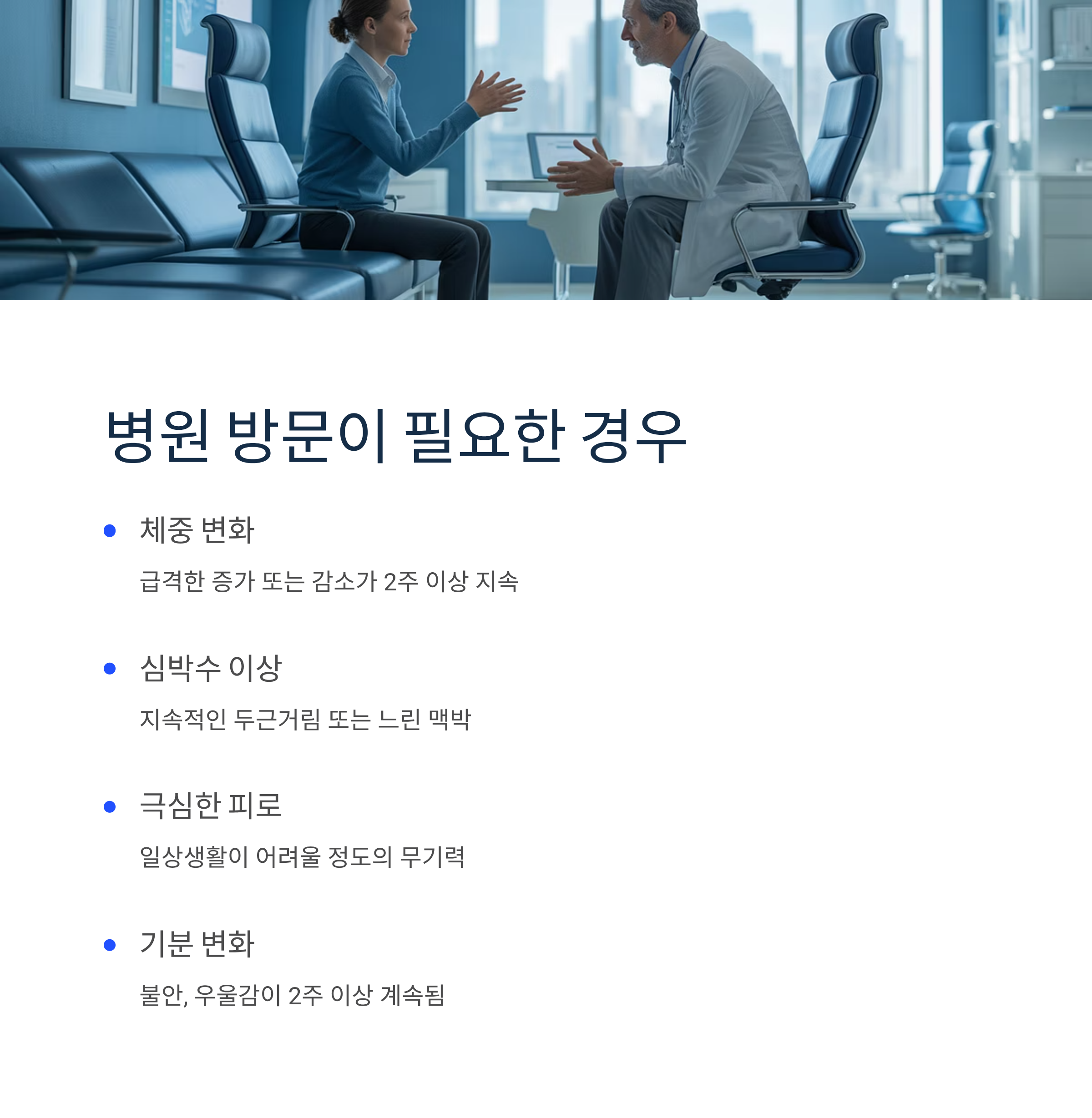 체중 변화, 심박수 이상, 극심한 피로, 기분 변화가 2주 이상 지속되면 내분비내과 진료를 받으시기 바랍니다.