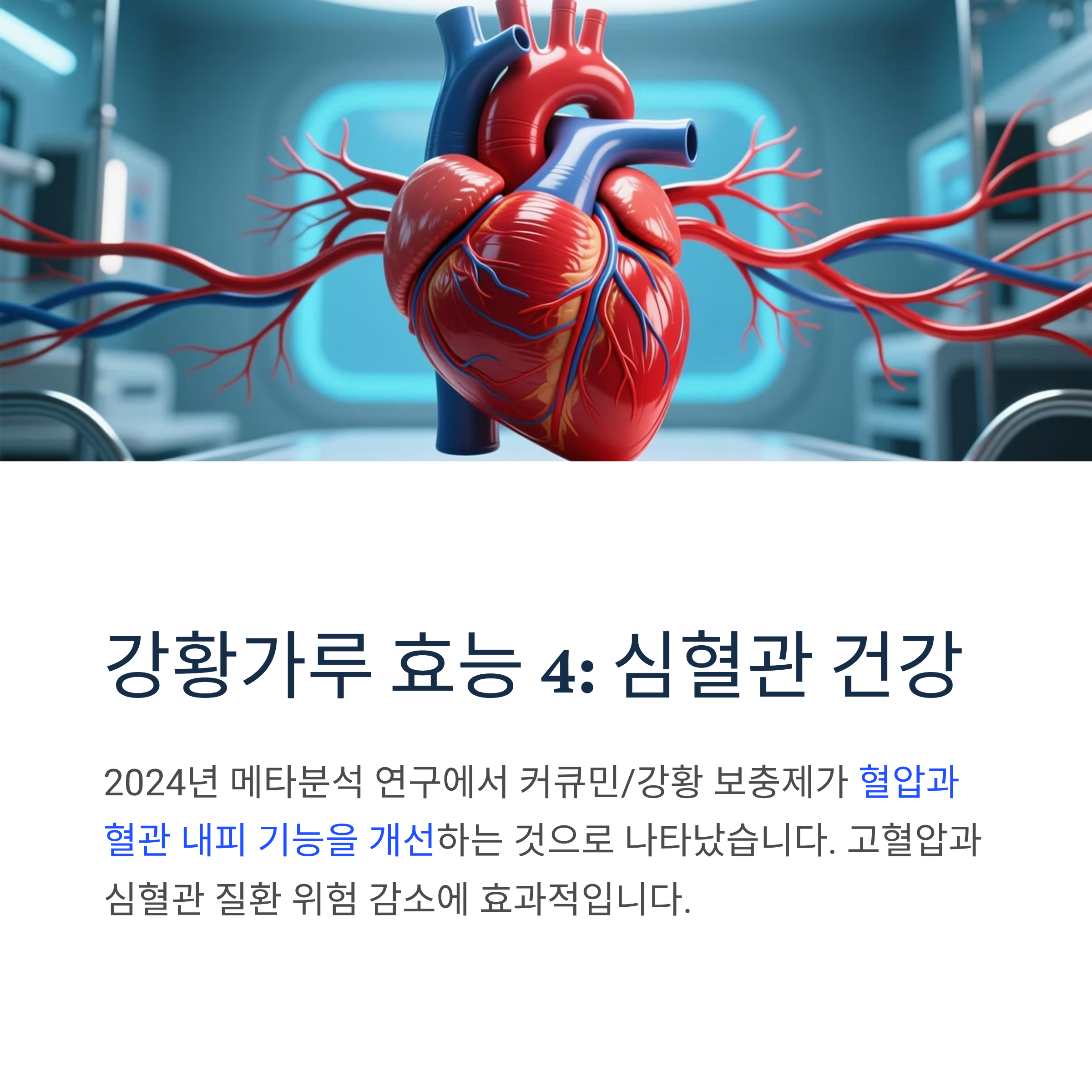 2024년 메타분석 연구에서 커큐민/강황 보충제가 혈압과 혈관 내피 기능을 개선하는 것으로 나타났습니다. 고혈압과 심혈관 질환 위험 감소에 효과적입니다.