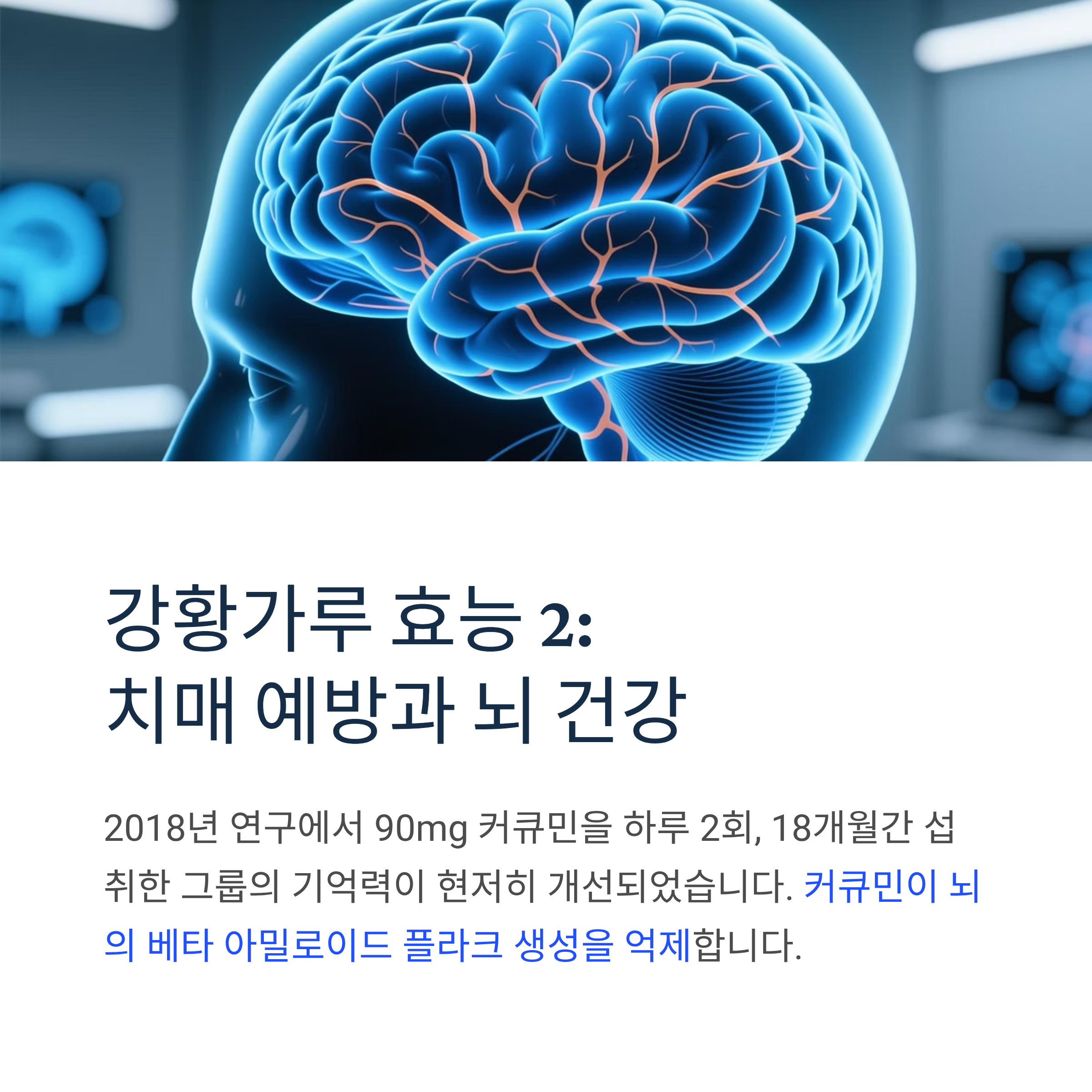 2018년 연구에서 90mg 커큐민을 하루 2회, 18개월간 섭취한 그룹의 기억력이 현저히 개선되었습니다. 커큐민이 뇌의 베타 아밀로이드 플라크 생성을 억제하여 알츠하이머병 예방에 도움을 준다는 것이 과학적으로 입증되었습니다.