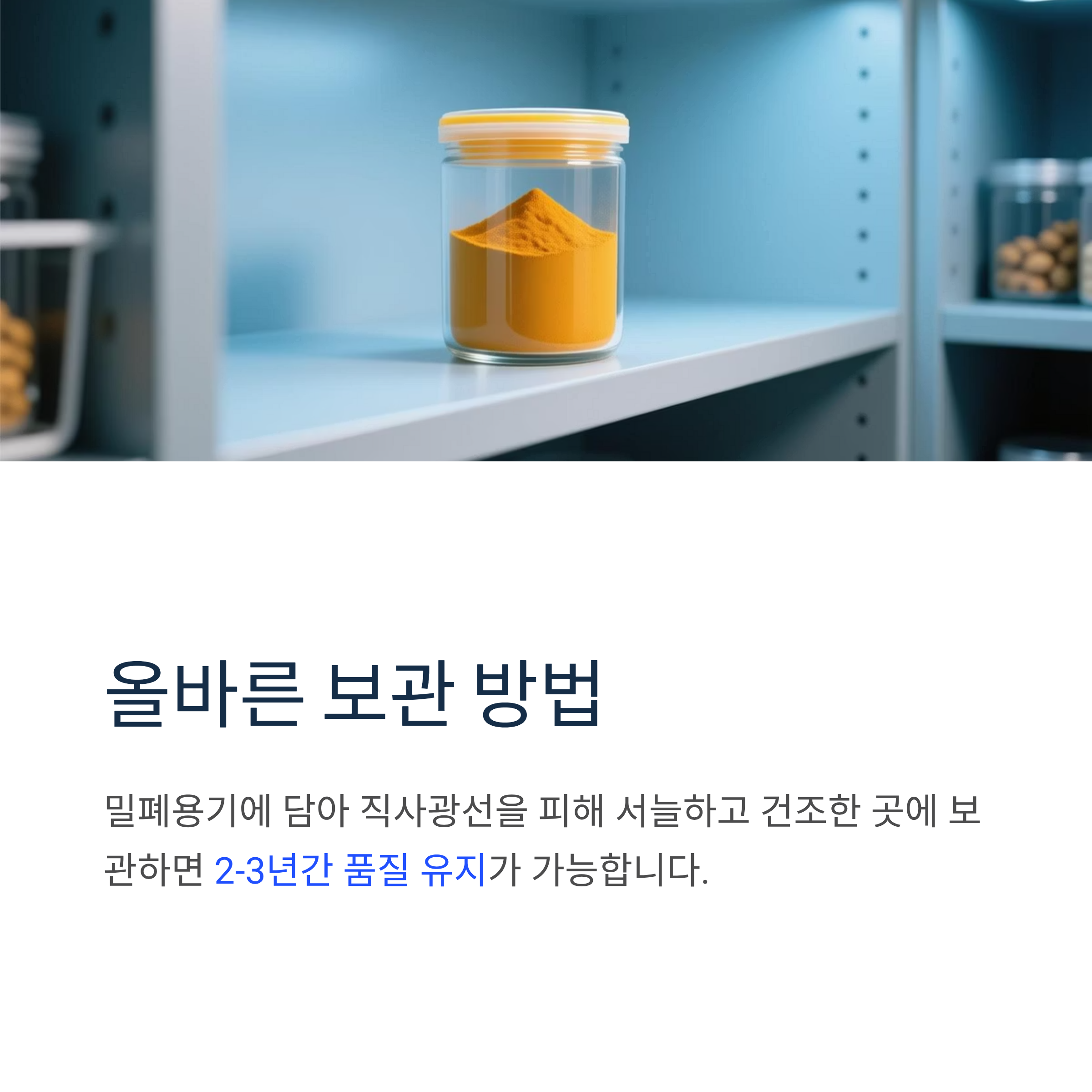 밀폐용기에 담아 직사광선을 피해 서늘하고 건조한 곳에 보관하면 2-3년간 품질 유지가 가능합니다.