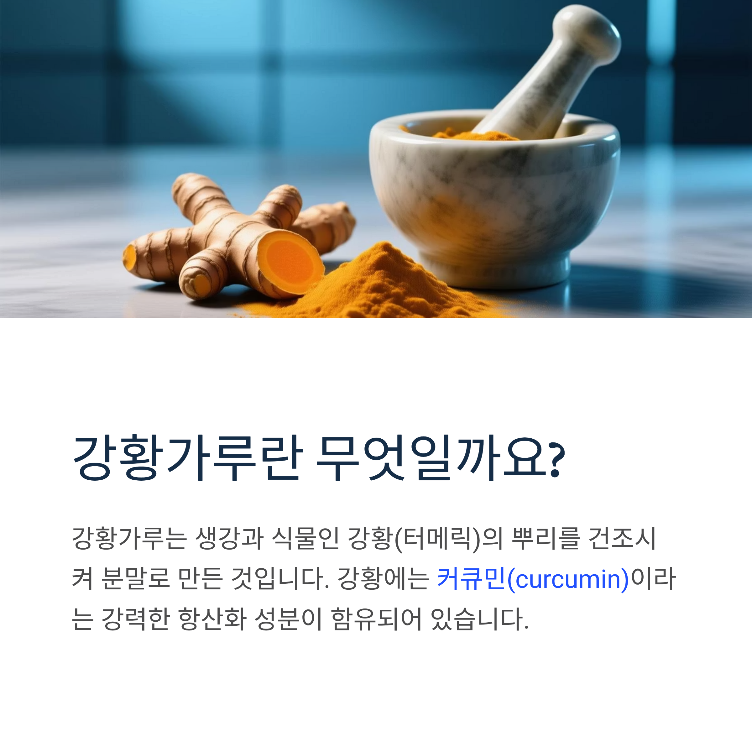 강황가루는 생강과 식물인 강황(터메릭)의 뿌리를 건조시켜 분말로 만든 것입니다. 강황에는 커큐민(curcumin)이라는 강력한 항산화 성분이 함유되어 있으며, 이 성분이 강황가루의 놀라운 건강 효능을 만들어냅니다.