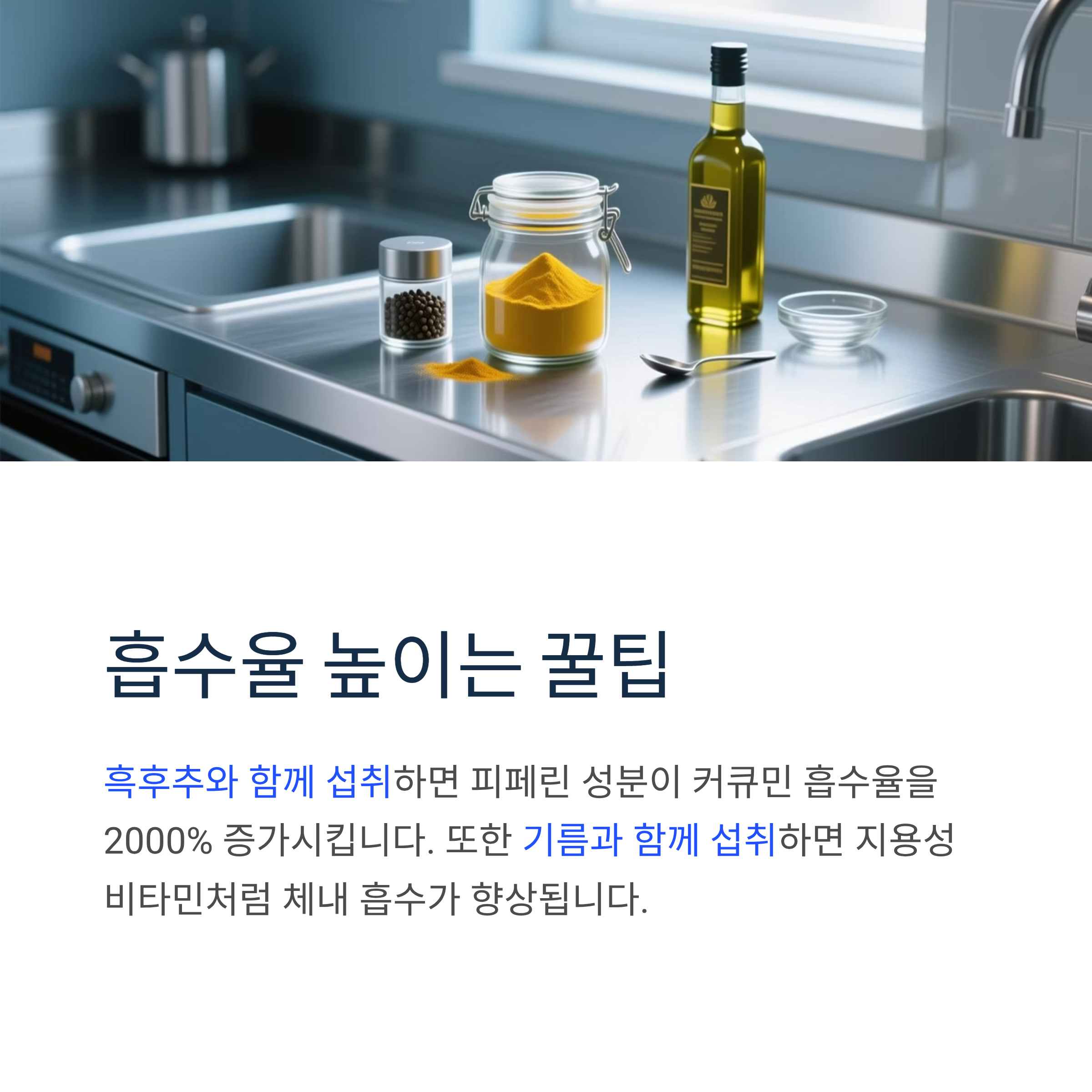 흑후추와 함께 섭취하면 피페린 성분이 커큐민 흡수율을 2000% 증가시킵니다. 또한 기름과 함께 섭취하면 지용성 비타민처럼 체내 흡수가 향상됩니다.