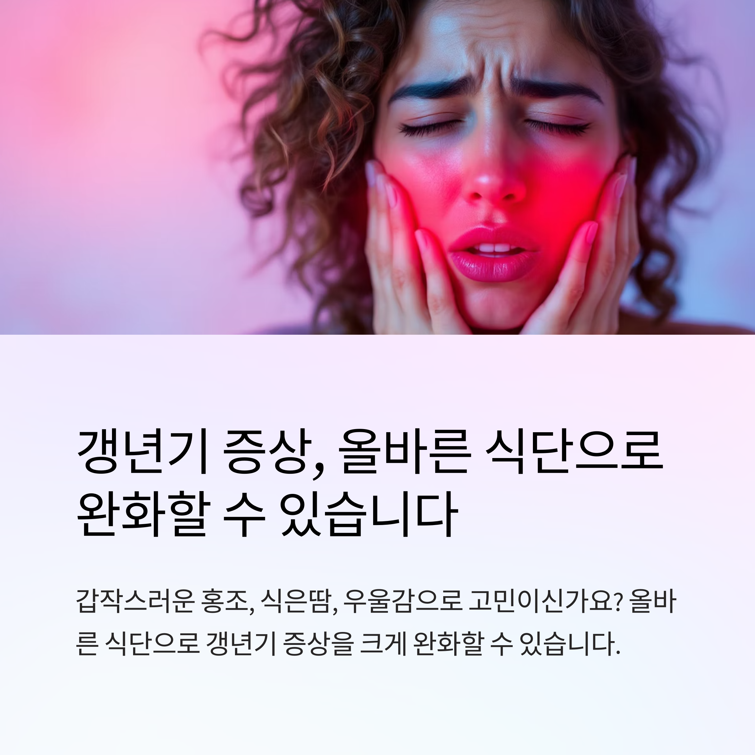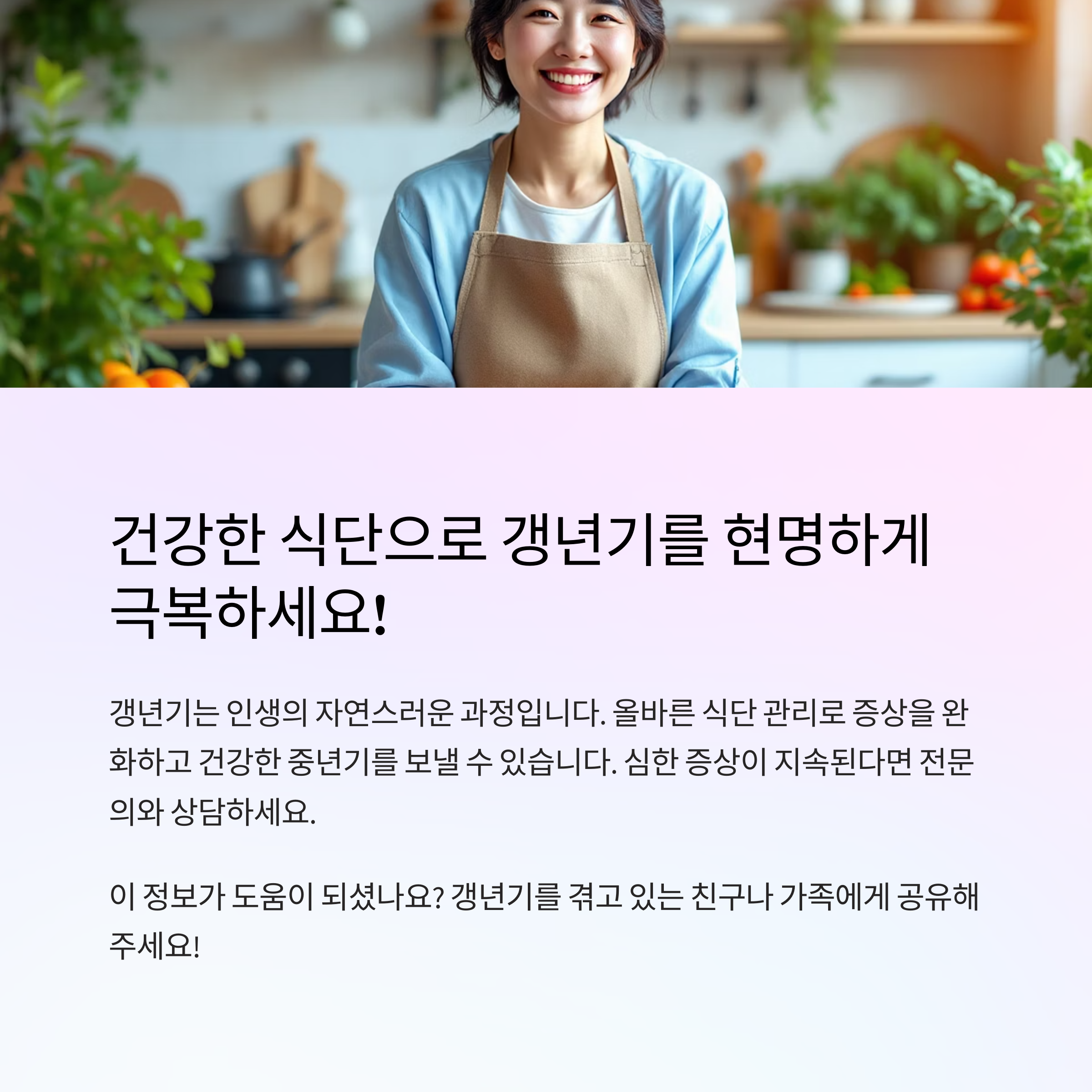 갱년기는 인생의 자연스러운 과정입니다. 올바른 식단 관리로 증상을 완화하고 건강한 중년기를 보낼 수 있습니다. 다만 심한 증상이 지속된다면 전문의와 상담하여 적절한 치료를 받으시기 바랍니다.