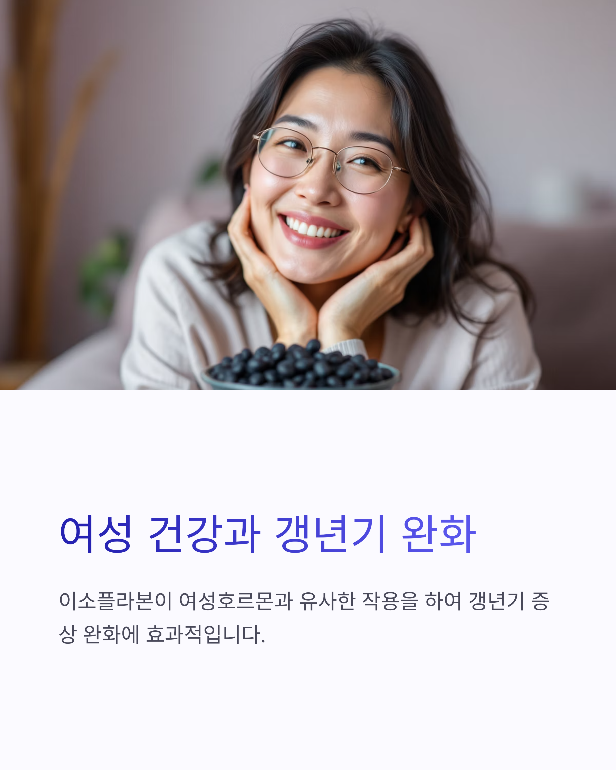 이소플라본이 여성호르몬과 유사한 작용을 하여 갱년기 증상 완화에 효과적입니다.