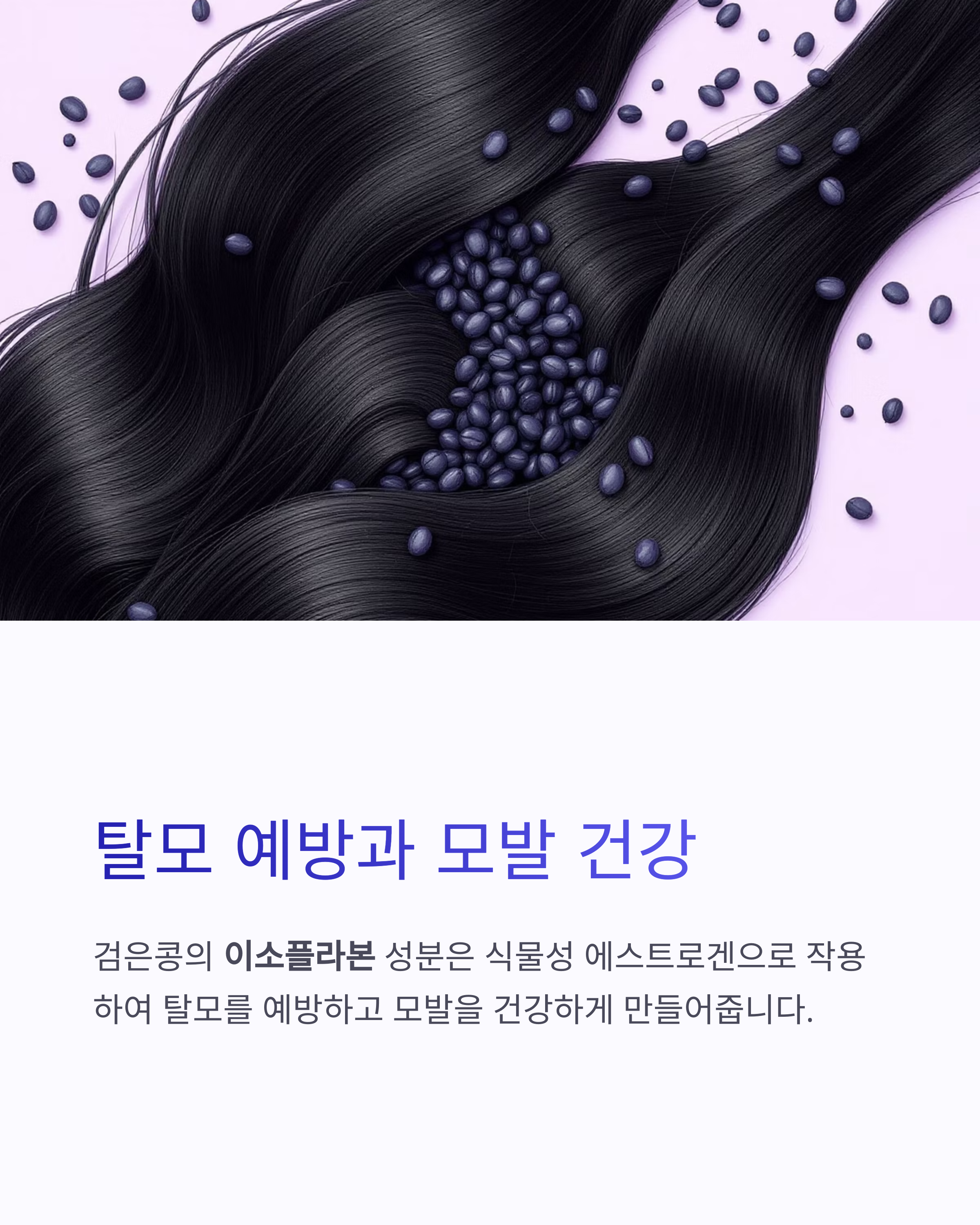 검은콩의 이소플라본 성분은 식물성 에스트로겐으로 작용하여 탈모를 예방하고 모발을 건강하게 만들어줍니다.