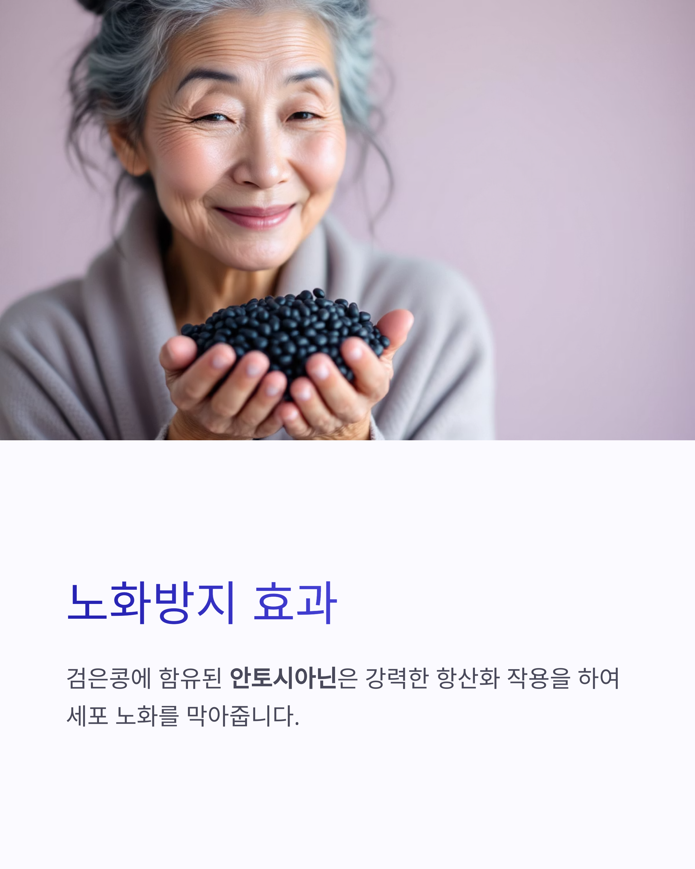 검은콩에 함유된 안토시아닌은 강력한 항산화 작용을 하여 세포 노화를 막아줍니다. 이는 일반 콩보다 4배나 높은 수치로, 젊음을 유지하는 데 탁월한 효과를 보입니다.