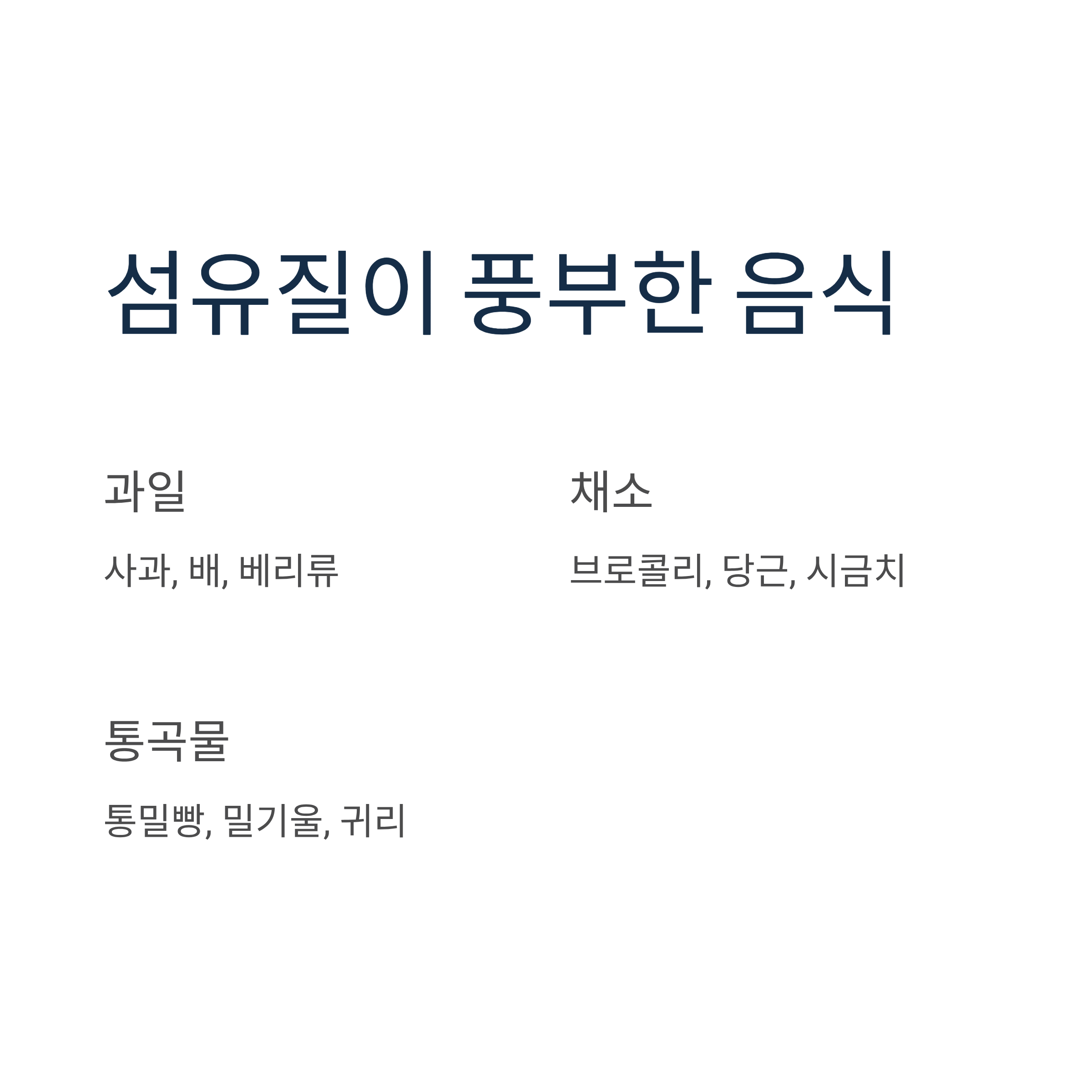 - 하루 20~30g의 섬유질 섭취: 과일, 채소, 통밀빵, 밀기울 등