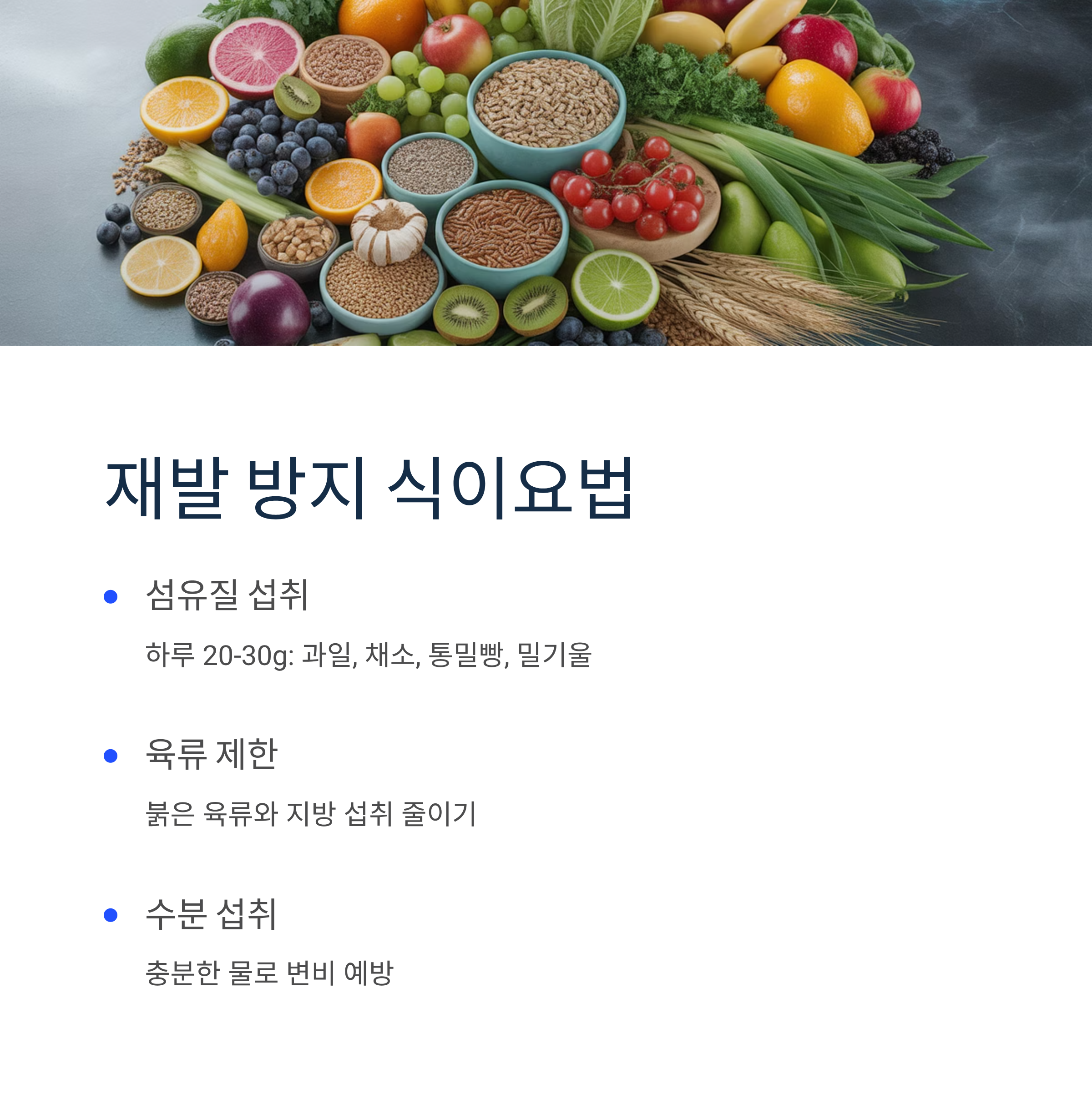 - 충분한 수분 섭취: 변비 예방이 핵심입니다