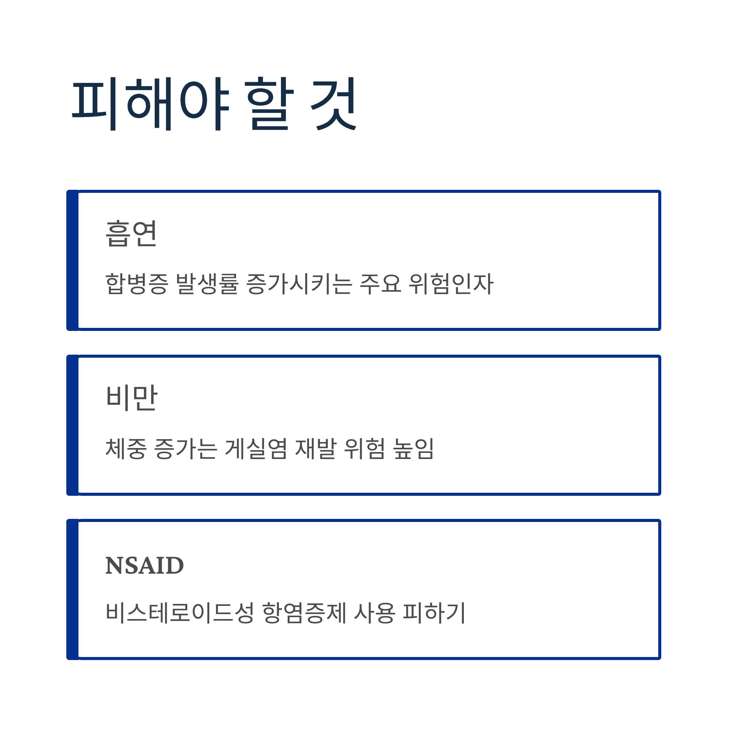 - 비스테로이드성 항염증제(NSAID) 사용 피하기: 재발 위험을 높일 수 있습니다