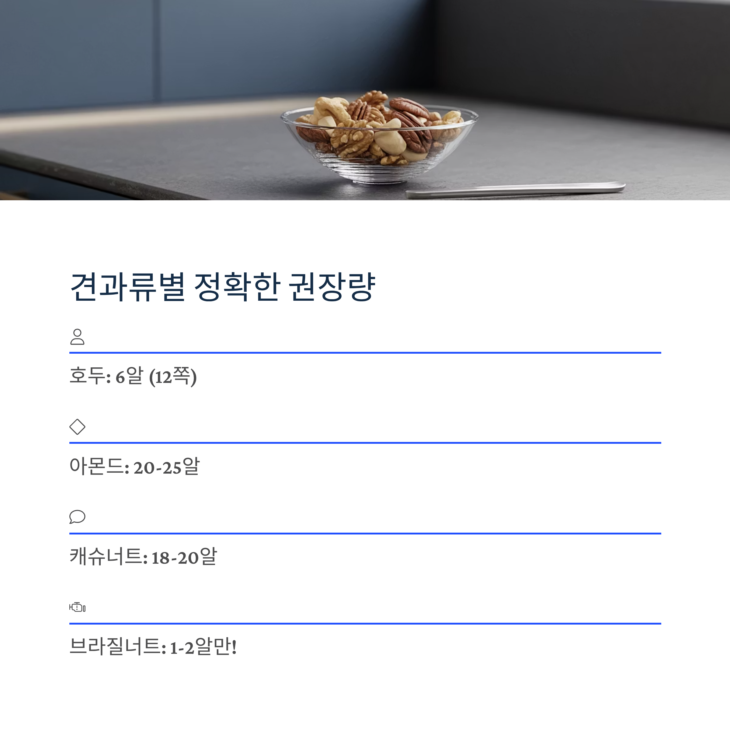 - 브라질너트: 1-2알 (셀레늄 과다 주의)