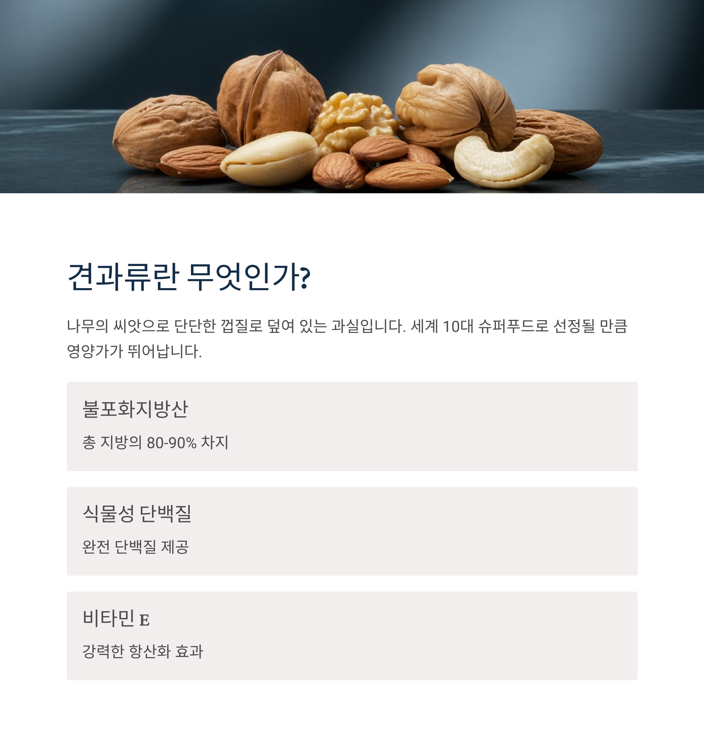 견과류는 나무의 씨앗으로 단단한 껍질로 덮여 있는 과실을 말합니다. 대표적으로 아몬드, 호두, 피스타치오, 캐슈너트, 피칸, 헤이즐넛, 브라질너트, 잣 등이 있으며, 세계 10대 슈퍼푸드로 선정될 만큼 영양가가 뛰어납니다.