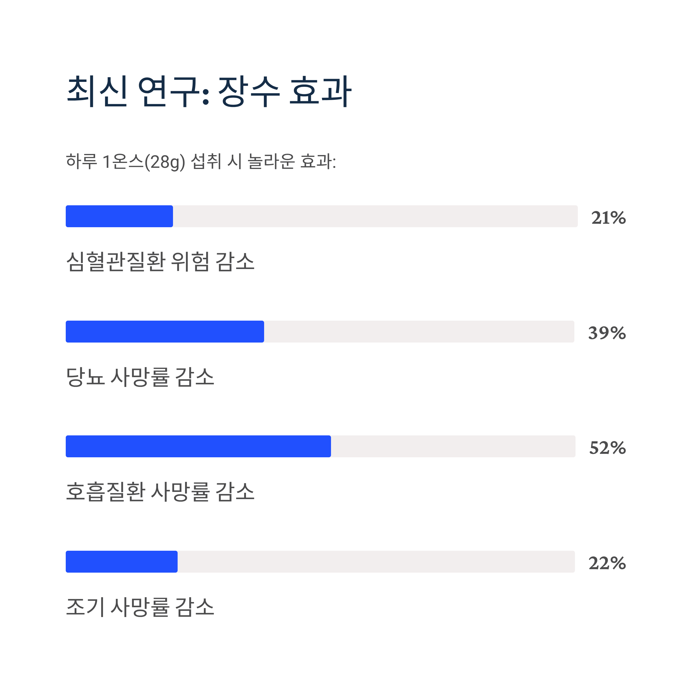 하루 1온스(28g) 섭취하면 심혈관질환 위험 21%, 당뇨 사망률 39%, 호흡 질환 사망률 52%, 조기 사망률 22% 등이 각각 낮아집니다.