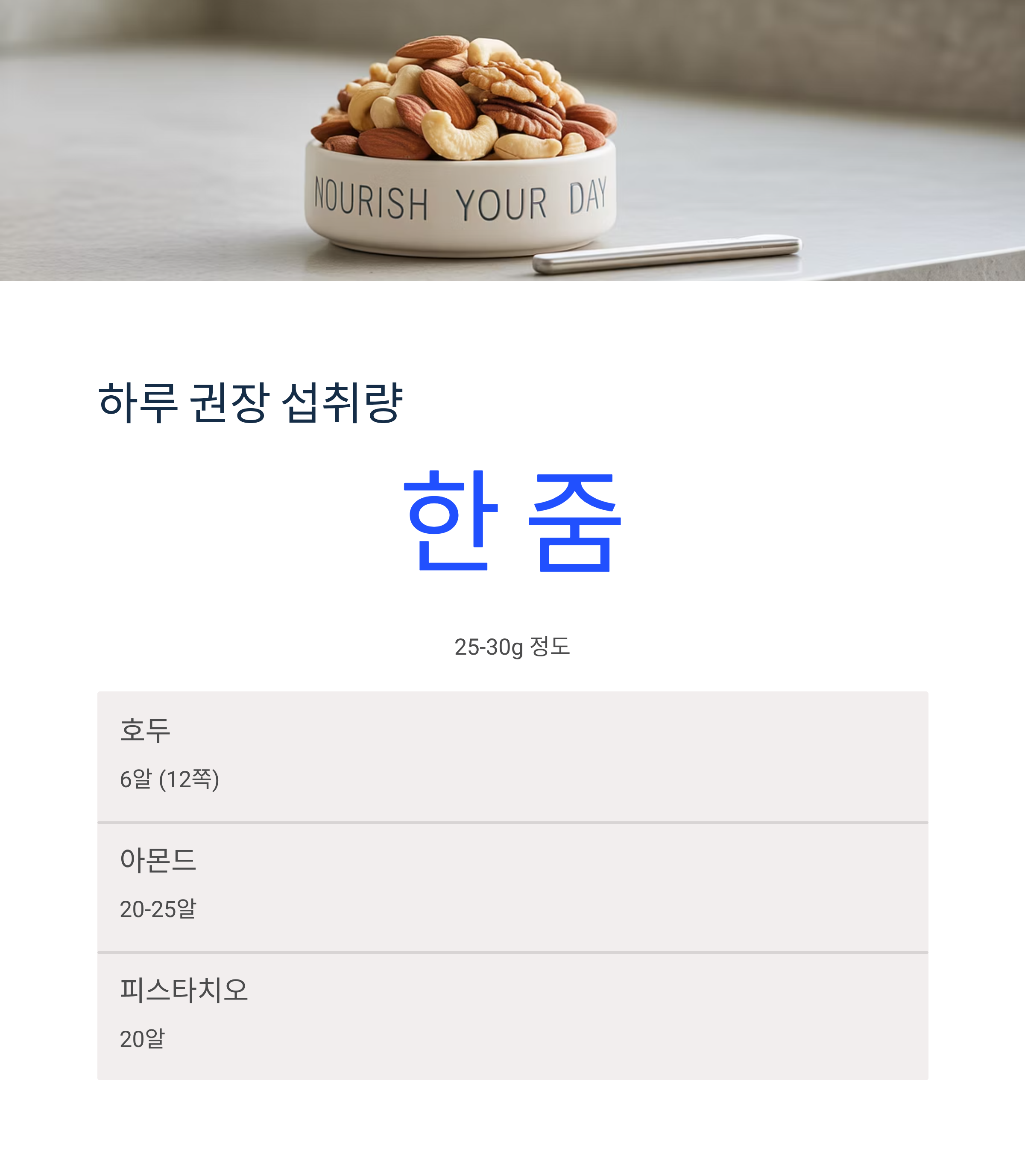 전문가들은 하루 한 줌 정도의 양을 권하는데, 이는 무게로 따지면 25~30g 정도입니다.