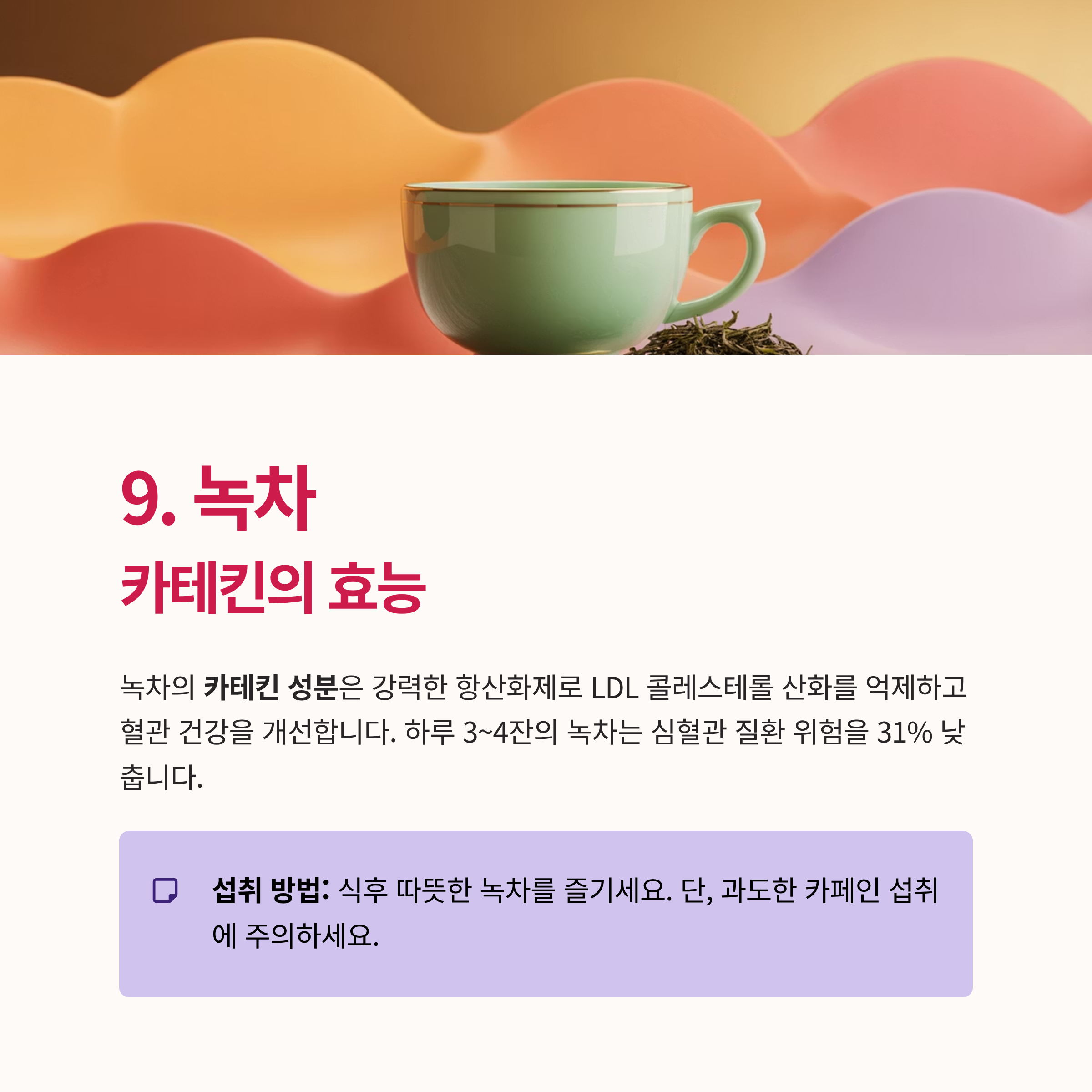 녹차의 카테킨 성분은 강력한 항산화제로 LDL 콜레스테롤 산화를 억제하고 혈관 건강을 개선합니다. 하루 3~4잔의 녹차는 심혈관 질환 위험을 31% 낮춥니다.