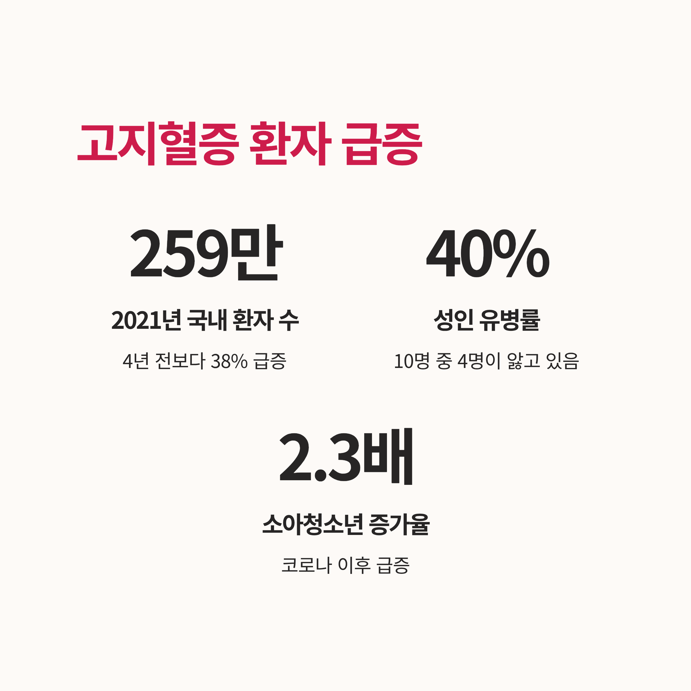 성인 10명 중 4명이 앓고 있는 고지혈증, 더 이상 남의 일이 아닙니다. 2021년 국내 고지혈증 환자는 259만 명으로 4년 전보다 38%나 급증했으며, 코로나 이후 소아청소년 고지혈증도 2.3배 증가했습니다.