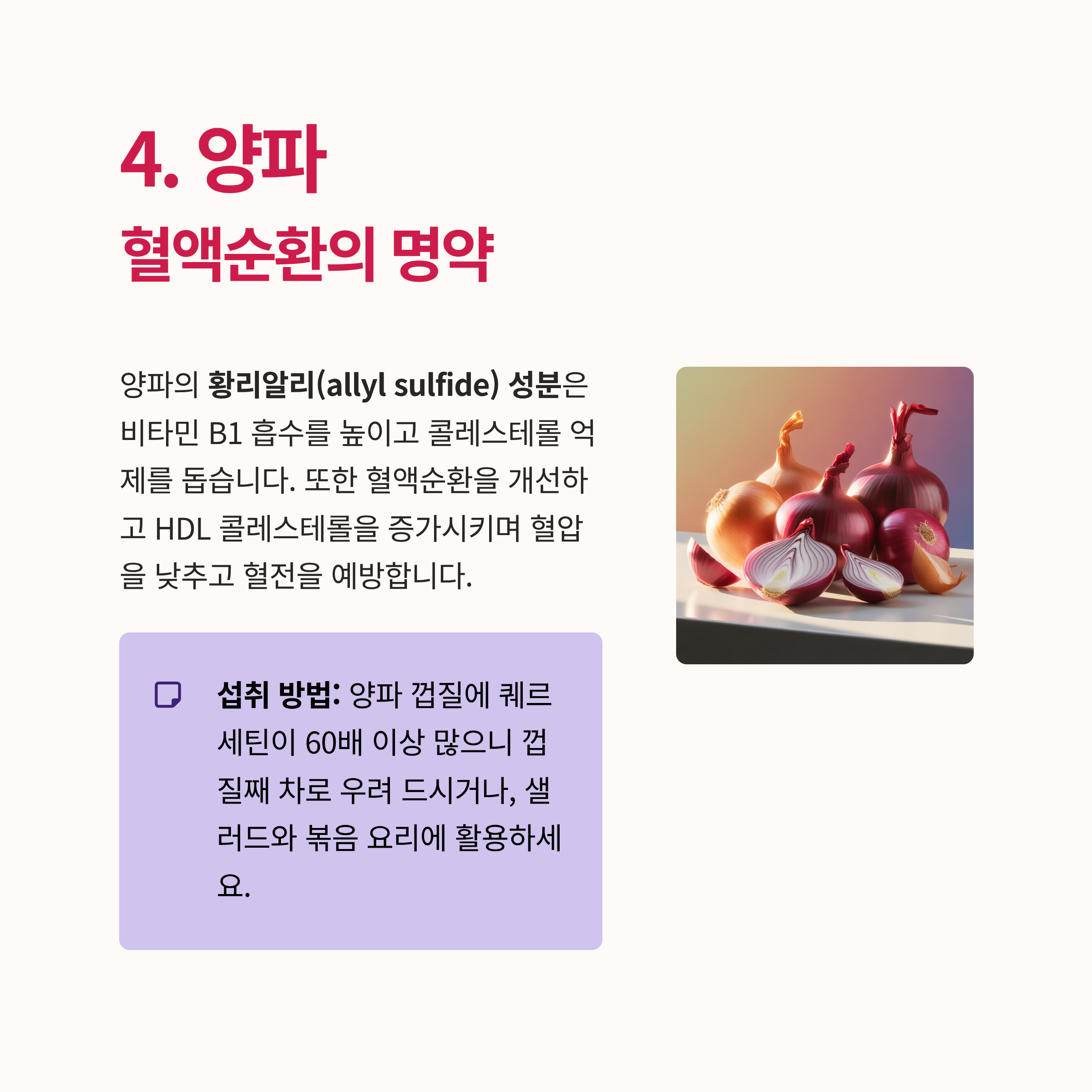 양파의 황리알리(allyl sulfide) 성분은 비타민 B1 흡수를 높이고 콜레스테롤 억제를 돕습니다. 또한 혈액순환을 개선하고 HDL 콜레스테롤을 증가시키며 혈압을 낮추고 혈전을 예방합니다.