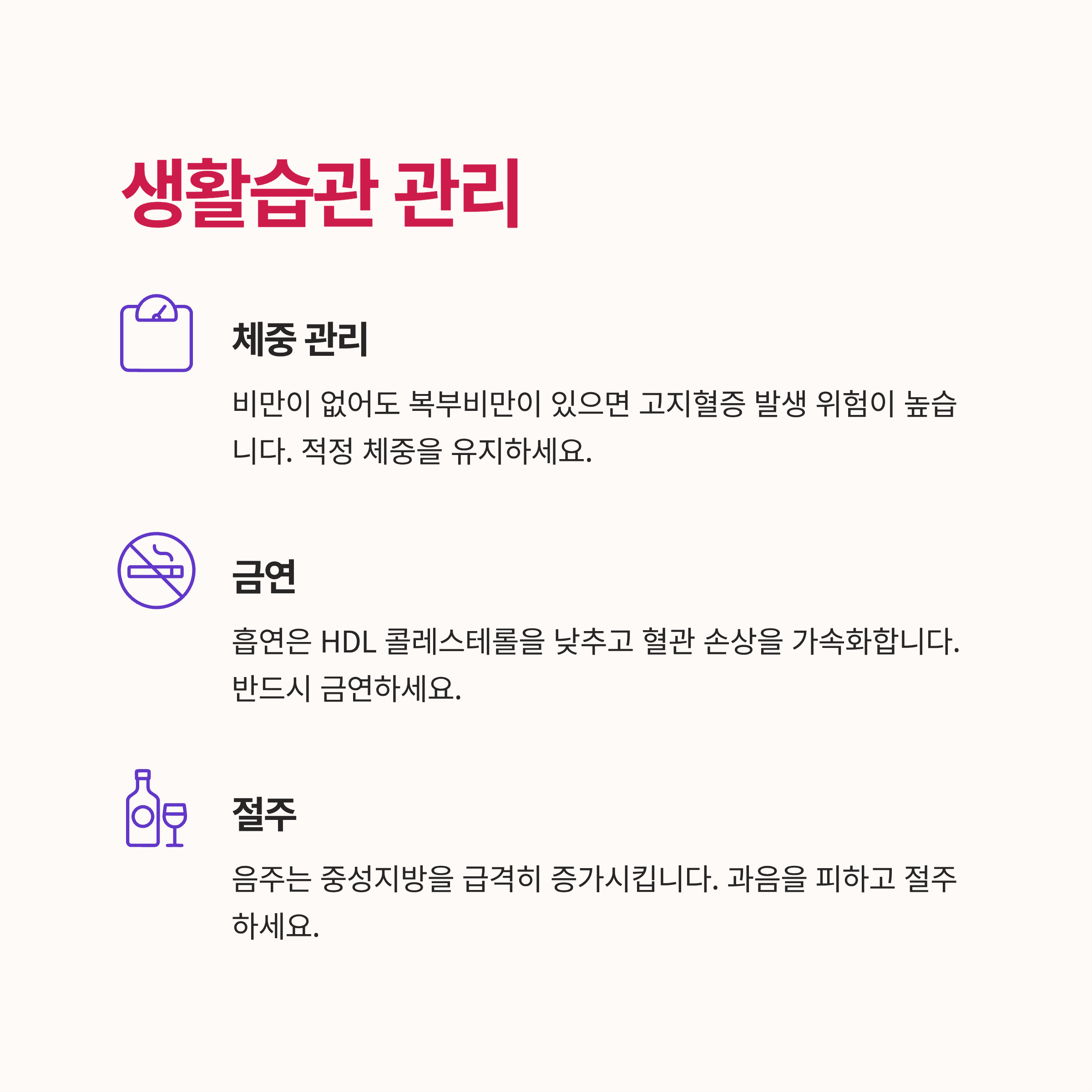 흡연은 HDL 콜레스테롤을 낮추고 혈관 손상을 가속화합니다. 음주는 중성지방을 급격히 증가시킵니다.