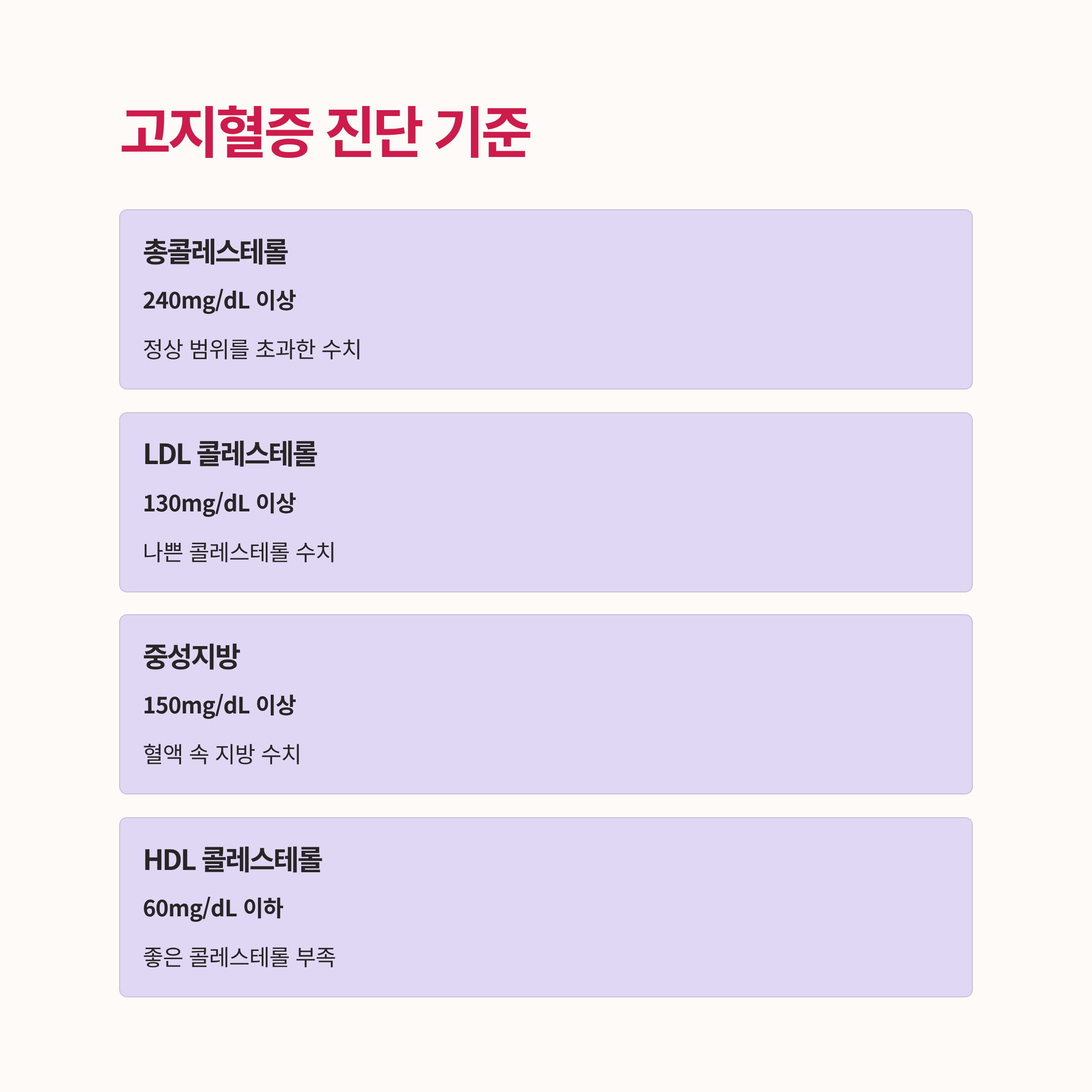 - LDL(나쁜 콜레스테롤): 130mg/dL 이상