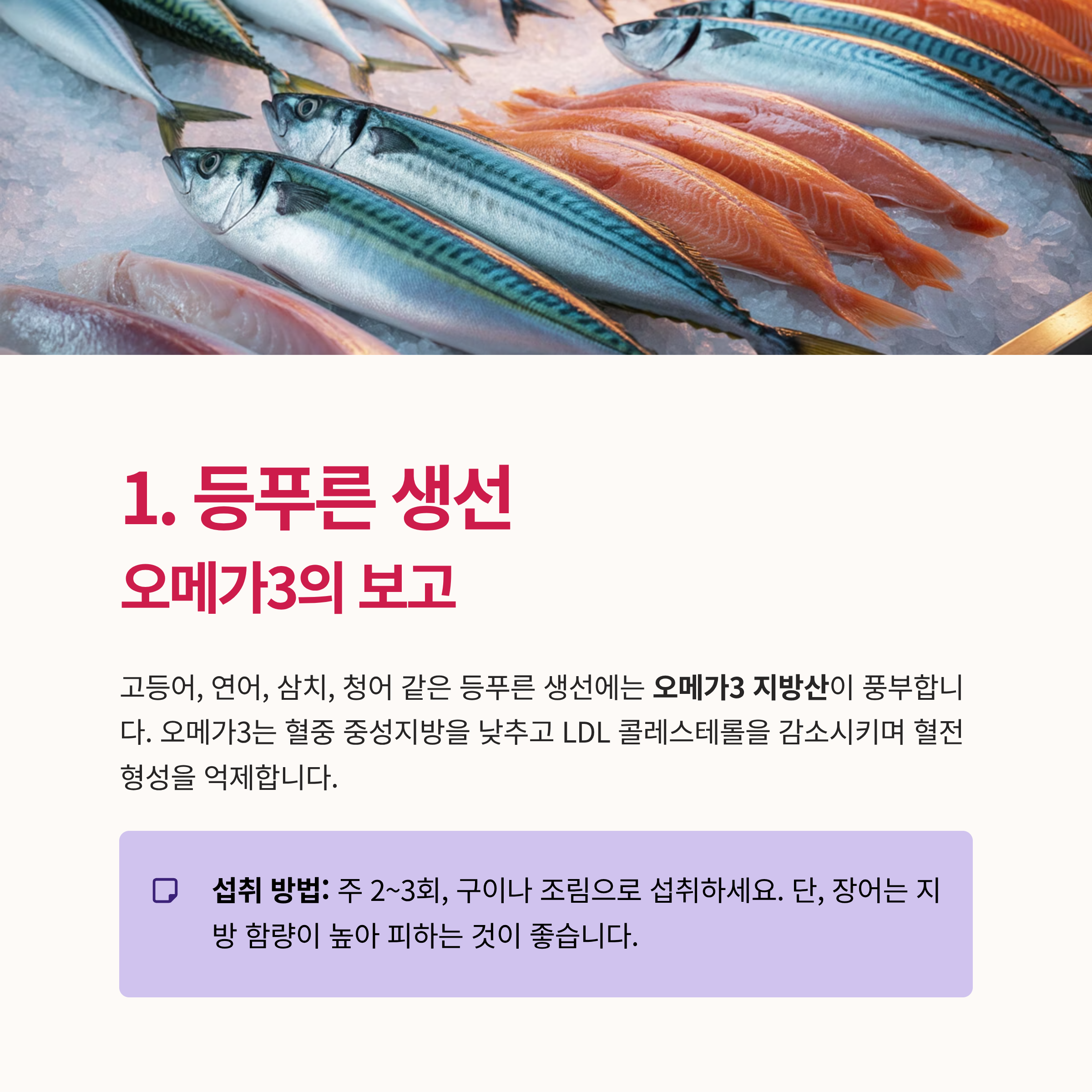고등어, 연어, 삼치, 청어 같은 등푸른 생선에는 오메가3 지방산이 풍부합니다. 오메가3는 혈중 중성지방을 낮추고 LDL 콜레스테롤을 감소시키며 혈전 형성을 억제합니다.