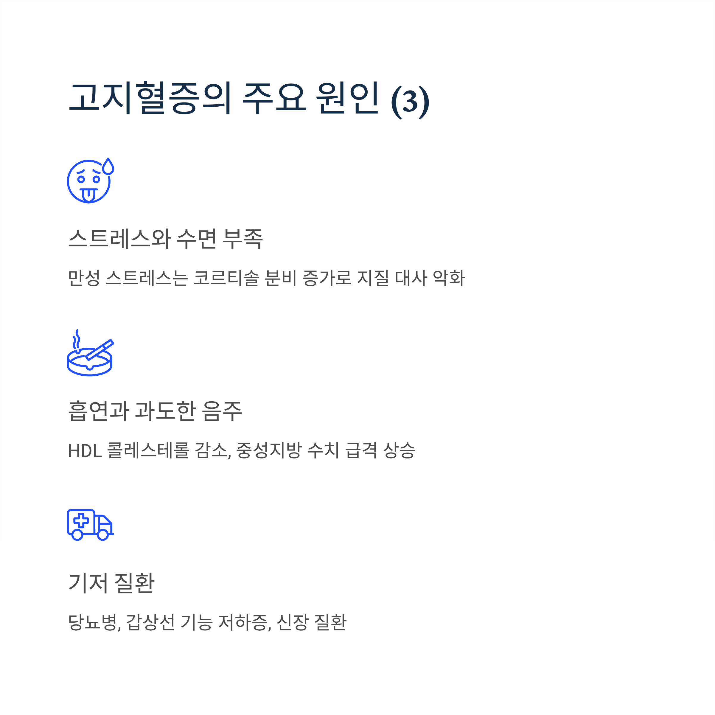 흡연은 HDL 콜레스테롤을 감소시키고, 과도한 음주는 중성지방 수치를 급격히 상승시킵니다.