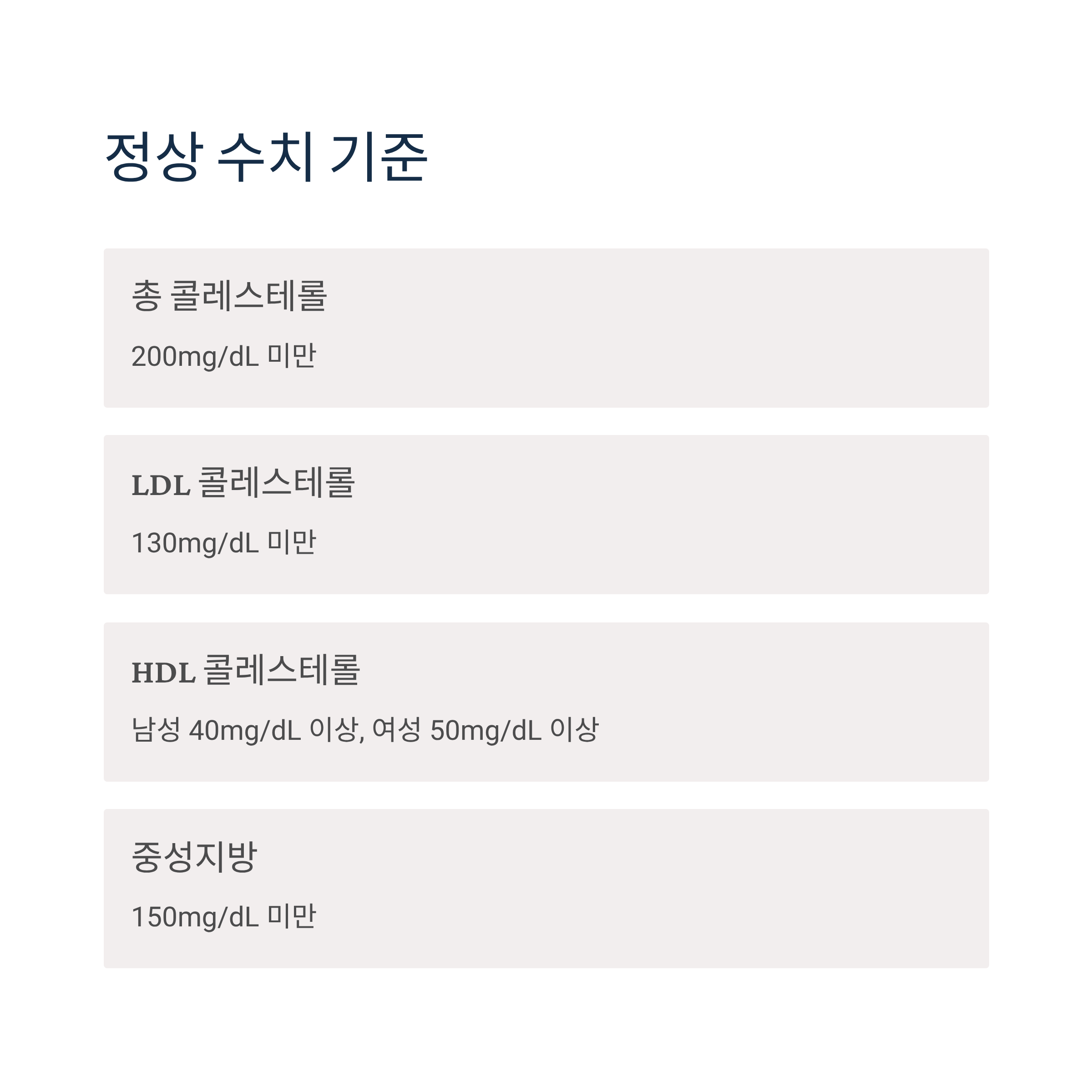 - HDL 콜레스테롤: 남성 40mg/dL 이상, 여성 50mg/dL 이상