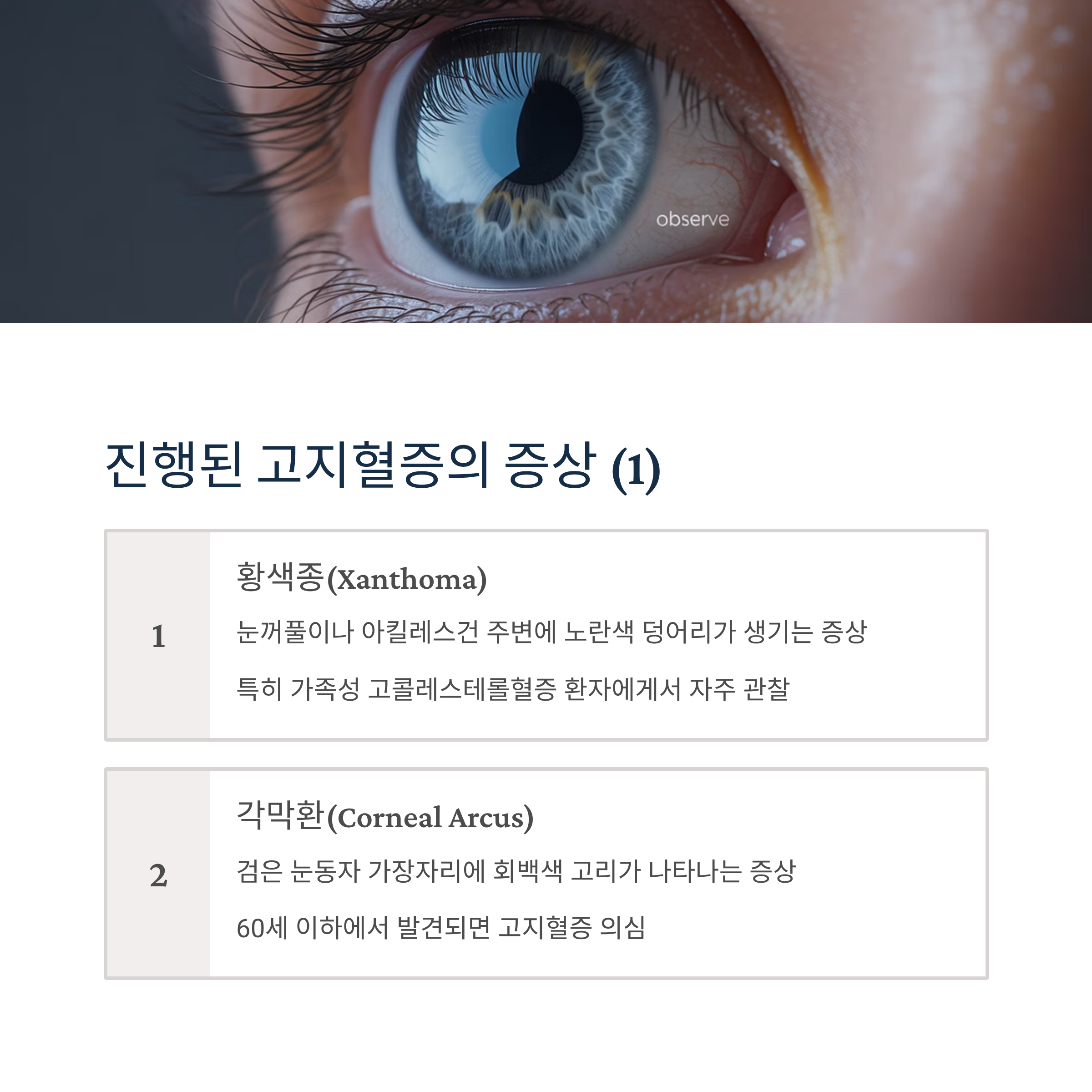 검은 눈동자 가장자리에 회백색 고리가 나타나는 증상으로, 60세 이하에서 발견되면 고지혈증을 의심해볼 수 있습니다.