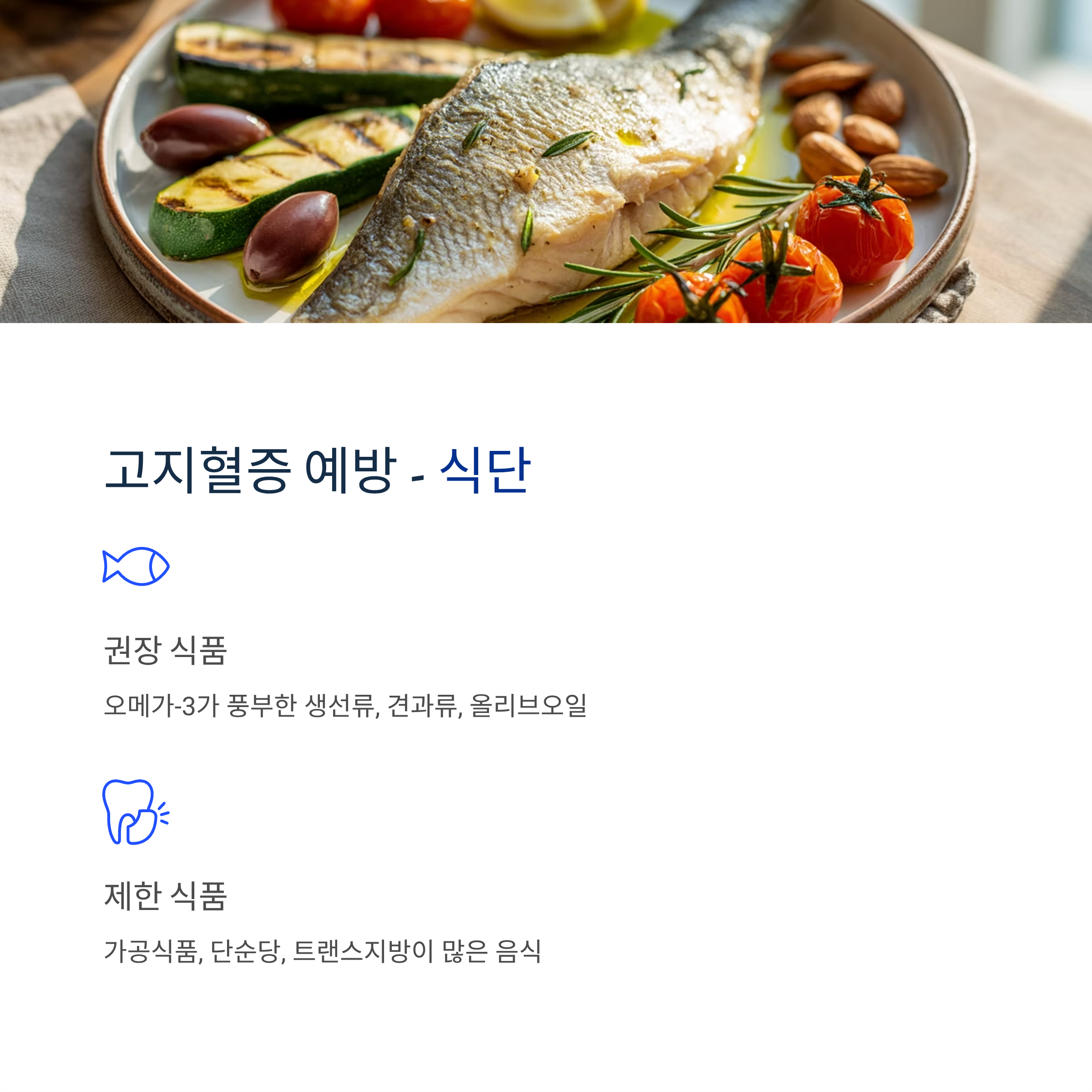 오메가-3가 풍부한 생선류, 견과류, 올리브오일 등을 섭취하고, 가공식품과 단순당 섭취를 줄이는 것이 중요합니다.