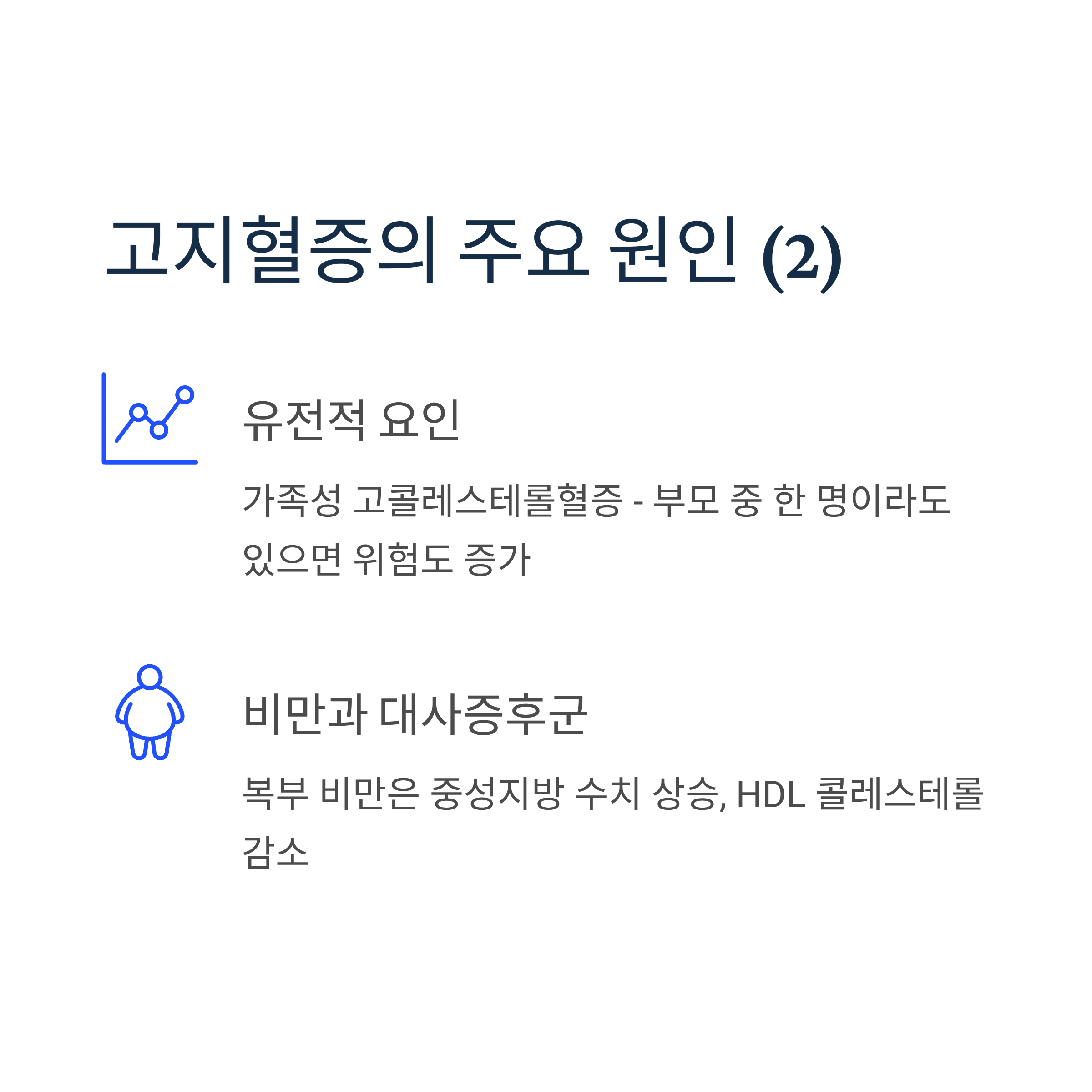 가족성 고콜레스테롤혈증처럼 유전적으로 콜레스테롤 대사에 문제가 있는 경우입니다. 부모 중 한 명이라도 고지혈증이 있다면 자녀도 위험도가 높아집니다.