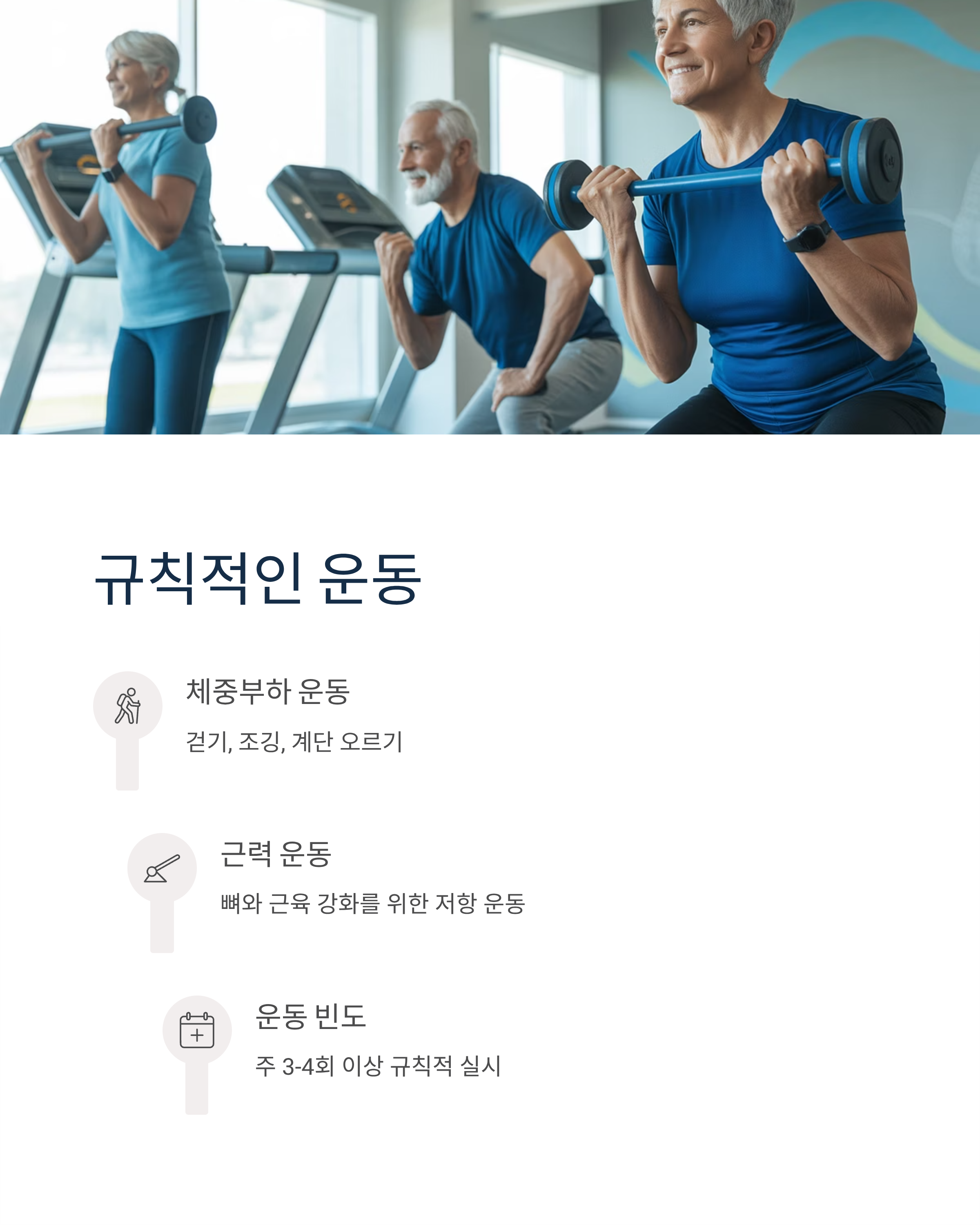 체중부하 운동(걷기, 조깅, 계단 오르기)과 근력 운동을 주 3~4회 이상 실시합니다.