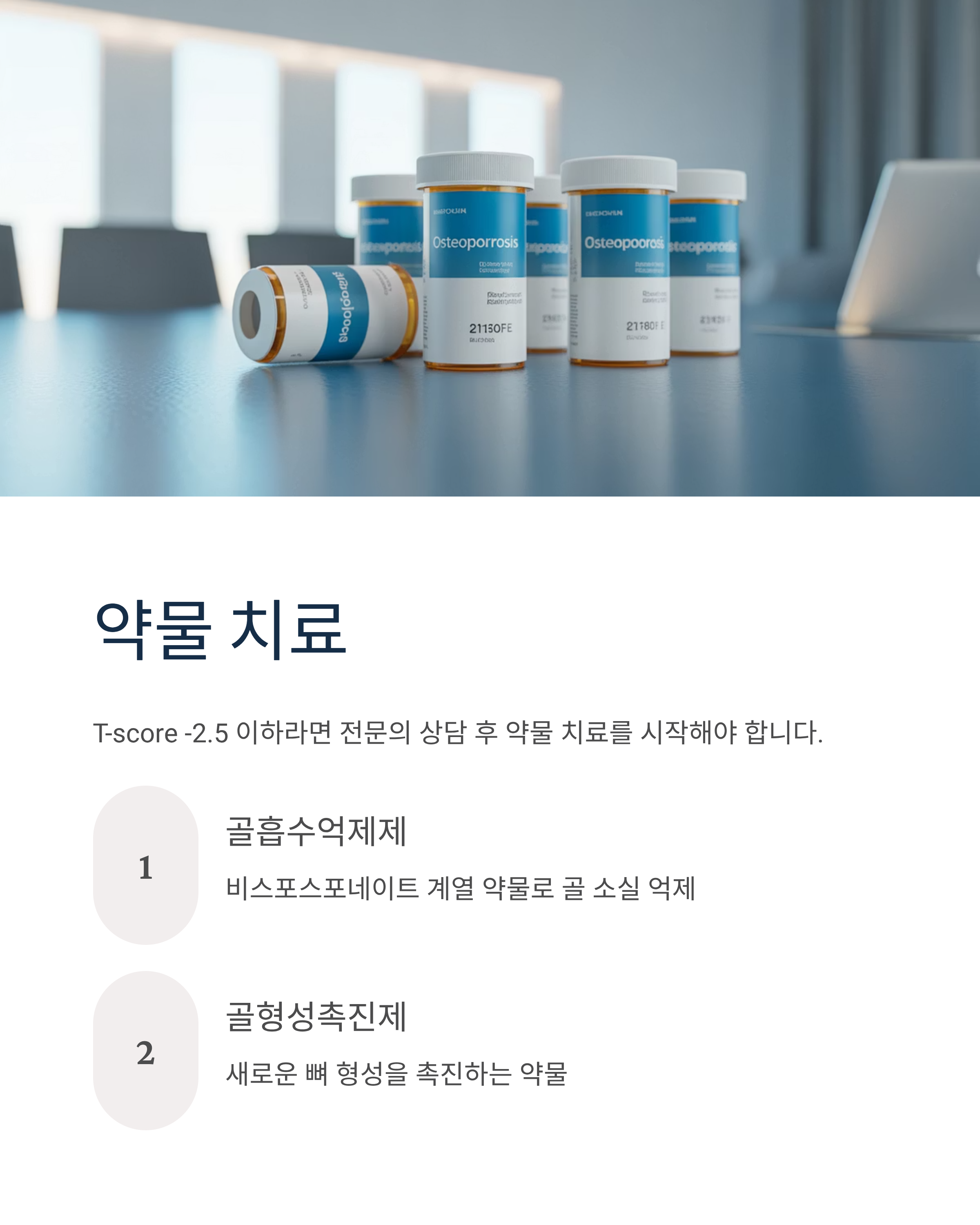T-score -2.5 이하라면 전문의 상담 후 약물 치료를 시작해야 합니다. 골흡수억제제(비스포스포네이트), 골형성촉진제 등이 사용됩니다.