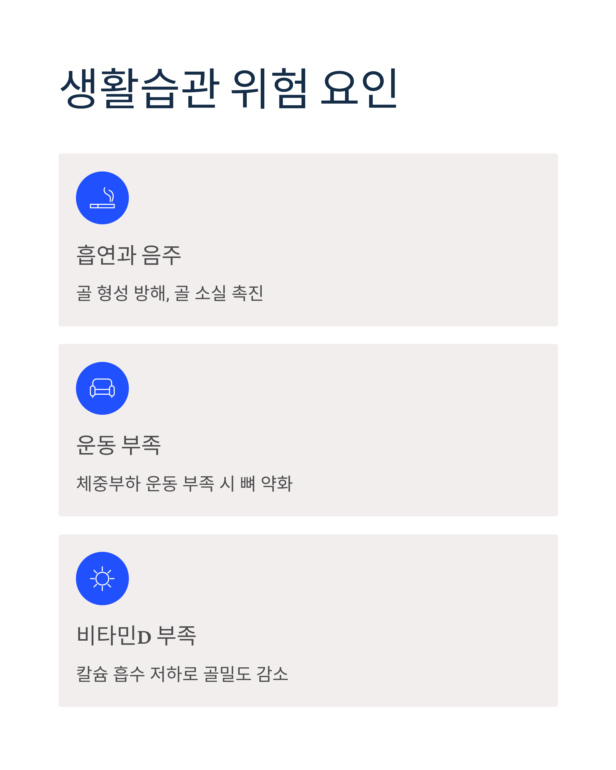 - 흡연과 음주: 골 형성을 방해하고 골 소실을 촉진