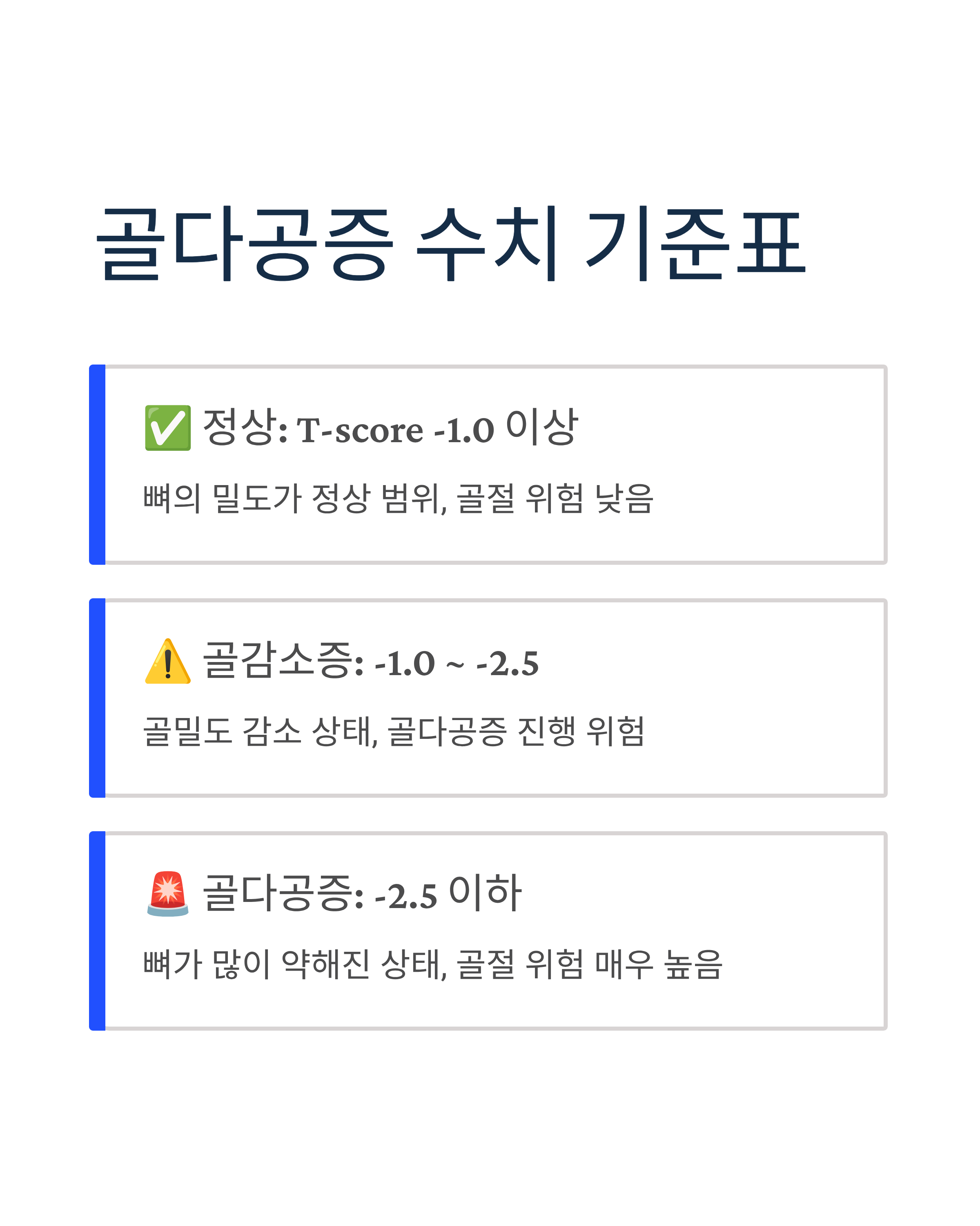 건강검진 결과지에 표기된 T-score를 확인하고, 이상이 있다면 즉시 전문의와 상담하세요. 골다공증은 조기 발견과 꾸준한 관리로 충분히 예방하고 치료할 수 있는 질환입니다.