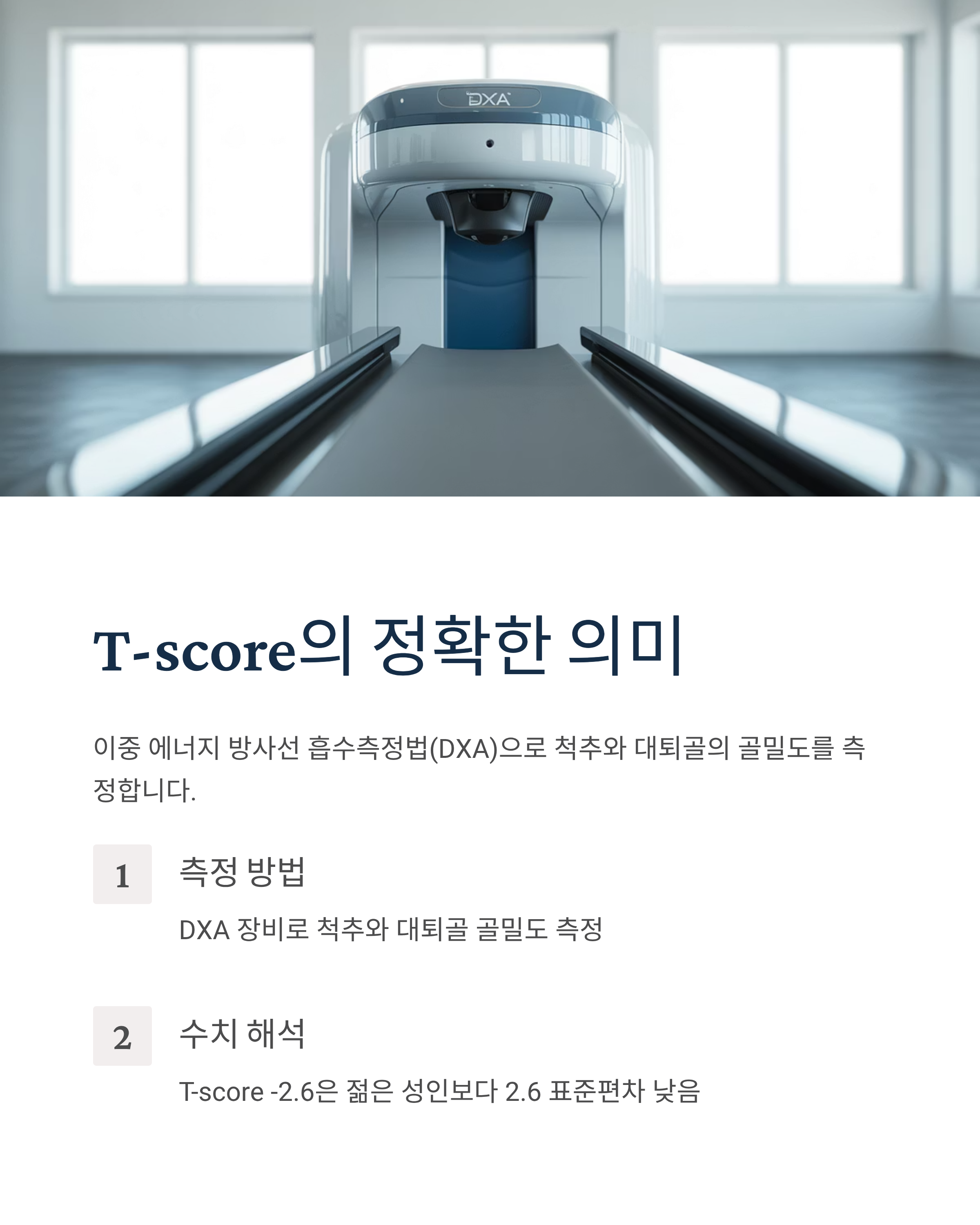 예를 들어 T-score가 -2.6이라면, 건강한 젊은 성인의 골밀도보다 2.6 표준편차만큼 낮다는 의미입니다. 이는 골다공증 진단 기준인 -2.5를 넘어선 수치로 즉시 치료가 필요한 상태입니다.